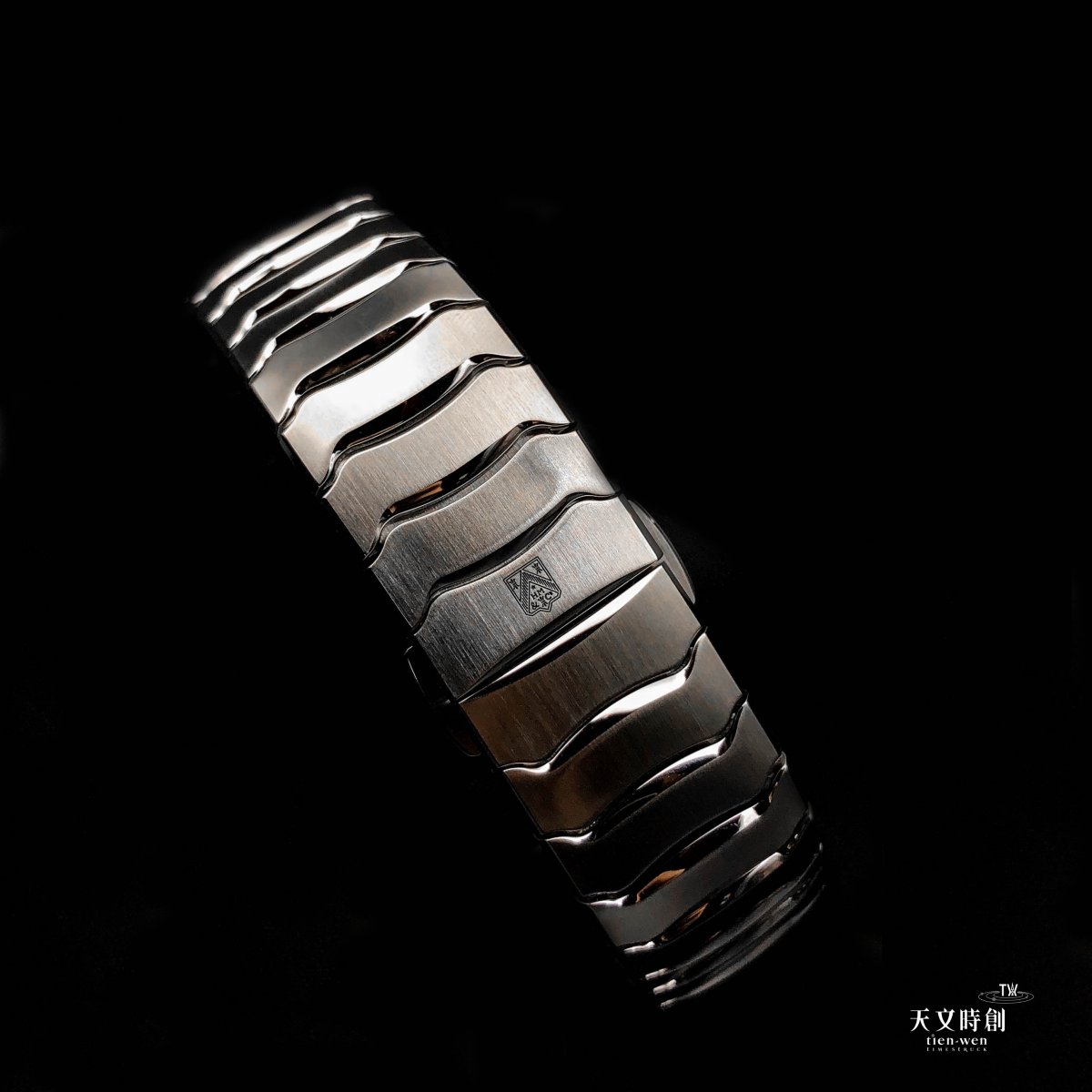 Streamliner的鍊帶雖然是單板帶,但每個鍊節都充滿了豐富的線條變化,彎曲的凹槽形狀相互扣合,單位鍊節的高度較扁,因此可以彎曲的弧度也比較細緻些;表面打磨大面積的髮絲紋,鍊節兩側及凹槽處施以亮面拋光。除了金屬鍊帶,錶殼甚至是按時按鈕同樣擁有豐富的曲線,並透過霧面與亮面二種質感的打磨來強化視覺。