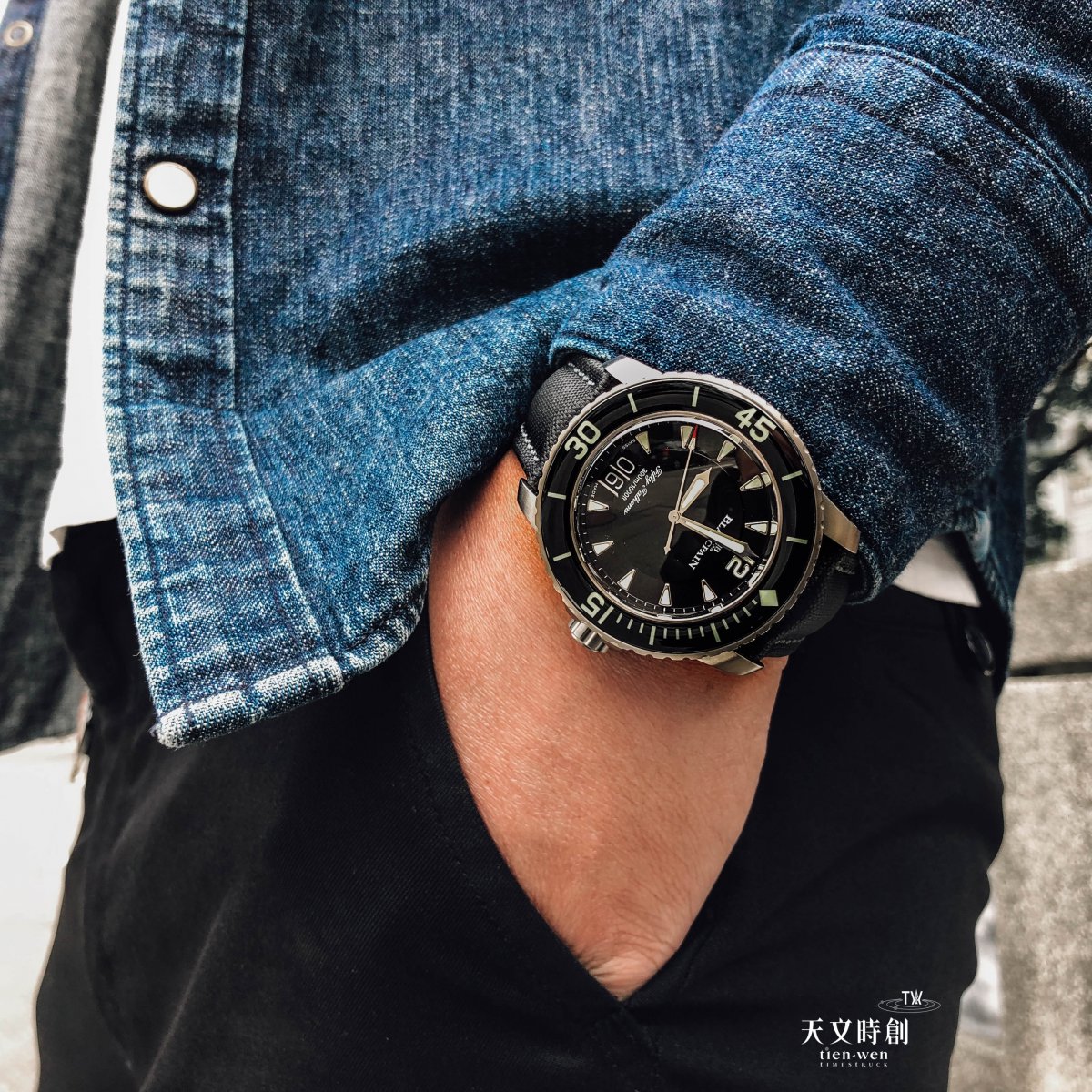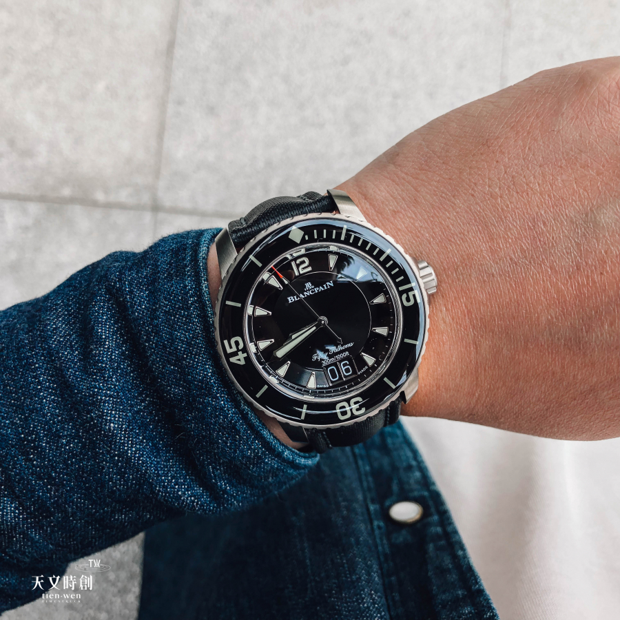 全新寶珀五十噚系列大日期腕錶採用鈦金屬材質,表徑為45毫米,表殼經緞面打磨,極具質感。腕錶搭配傳統的寶珀五十噚單向旋轉表圈及藍寶石玻璃表鏡,極為復古。黑色錶盤採用雙層設計,指針和時標均塗覆螢光物料,具有良好的夜光性能,確保在任何環境下都能清晰讀時。另外潛水表圈和錶冠採用坑紋設計,方便抓握調校,同時更加安全可靠。