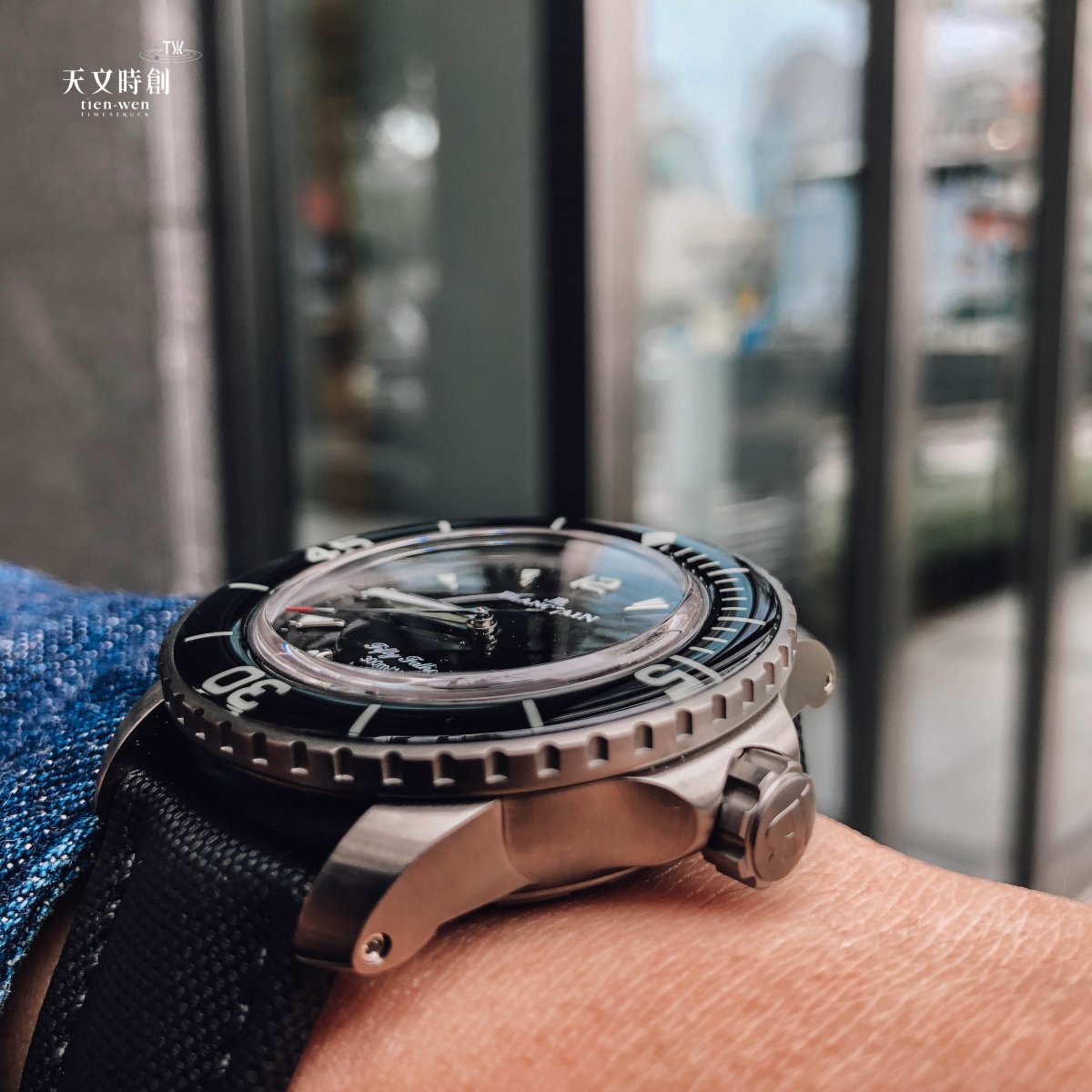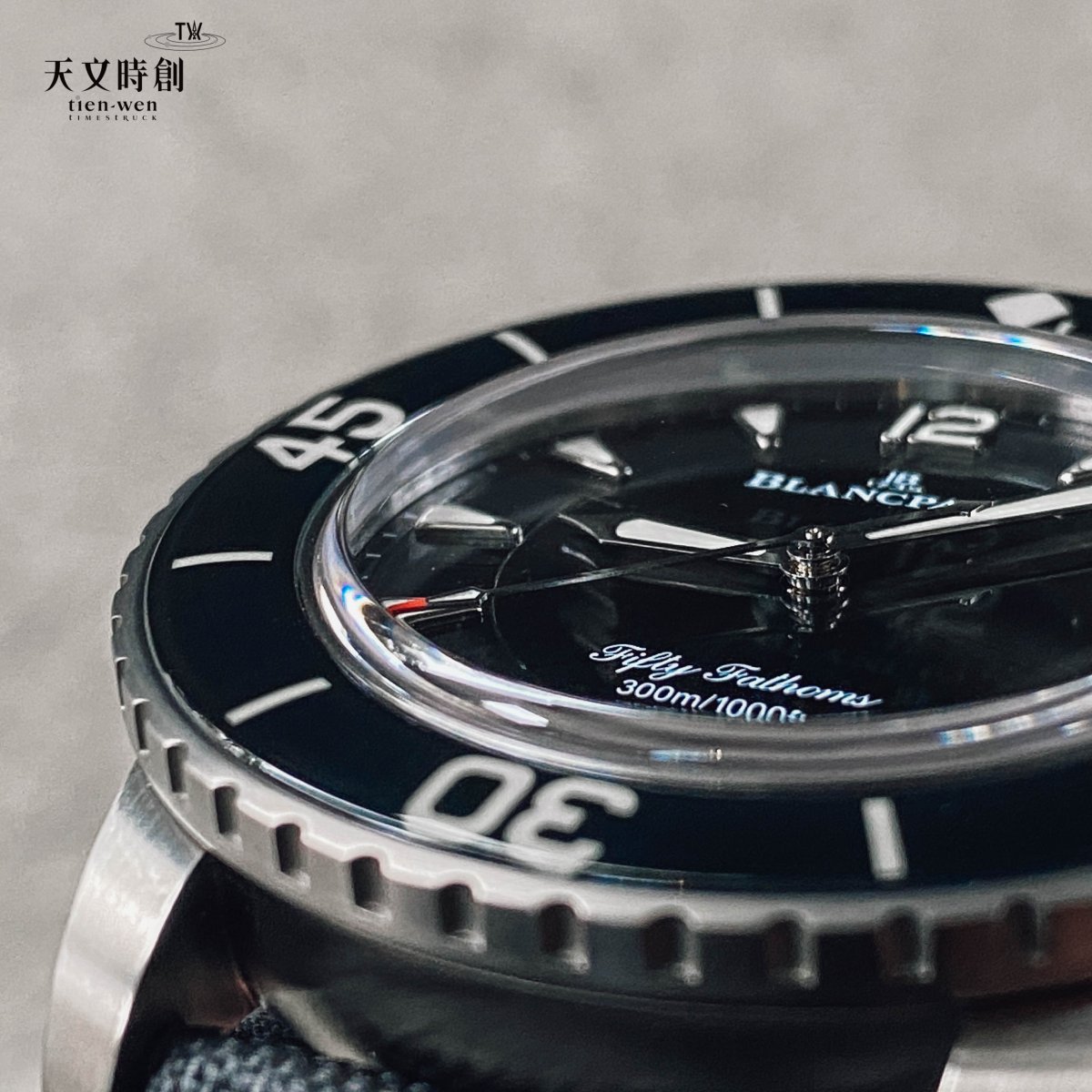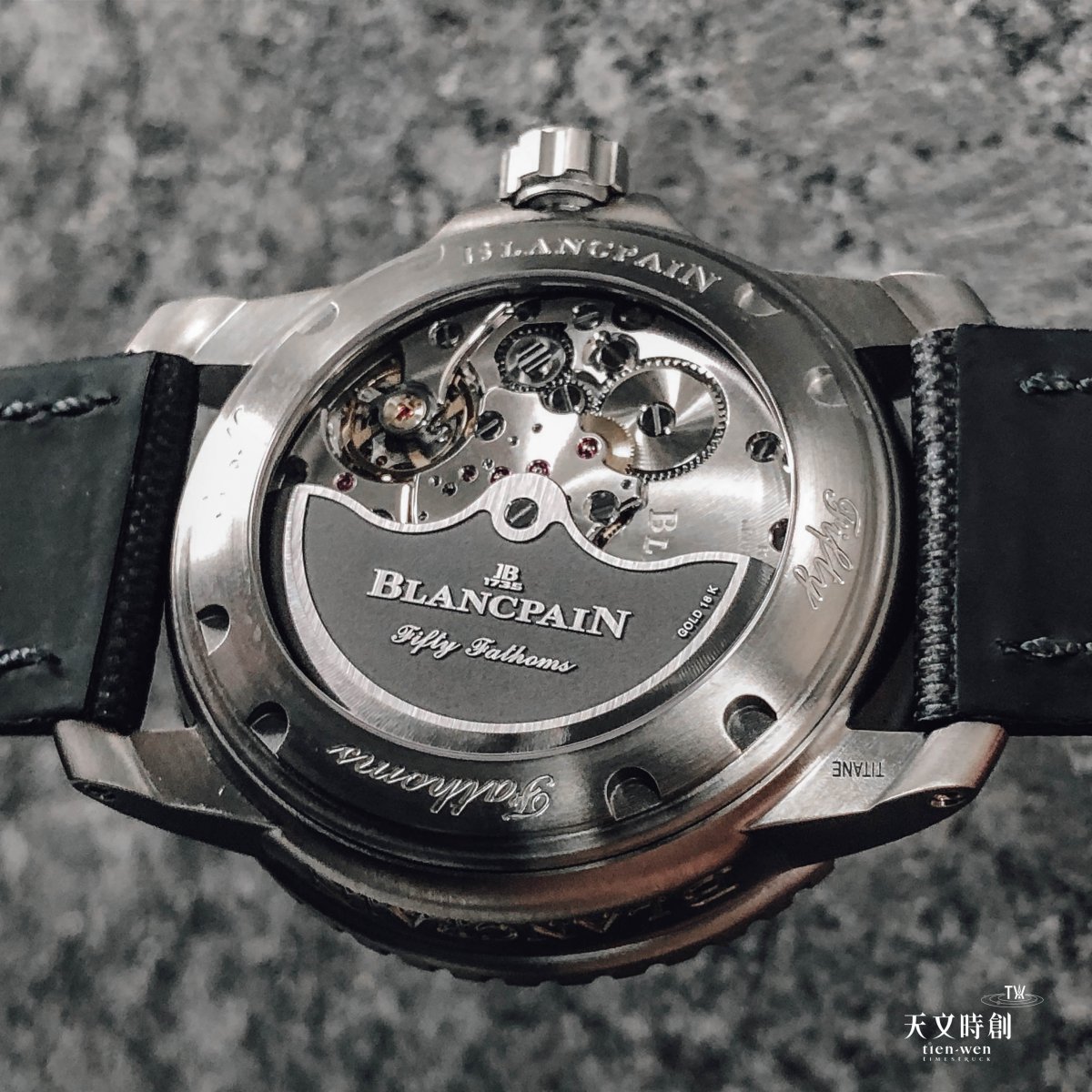 18k金自動盤鍍黑處理,讓Fifty Fathoms盡顯別具一格的魅力