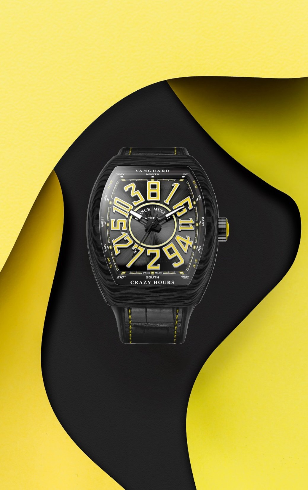 Crazy Hours是Franck Muller最具代表性的設計,而這次是品牌首度將Vanguard錶殼與Crazy Hours式錶盤設計合二為一,造成這款亞洲限量版Vanguard Crazy Hours的獨有設計。手工鑲飾的黃色浮雕數字時標,配上運動氣息濃厚而且輕巧的碳纖維錶殼,酒桶形錶殼略大,加強了剛陽味道。自動上鍊機芯有42小時動力儲備。