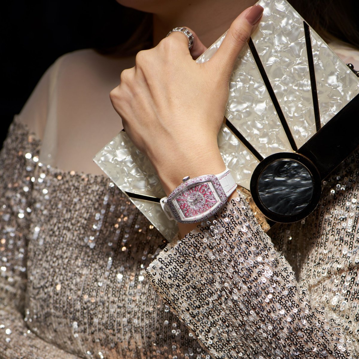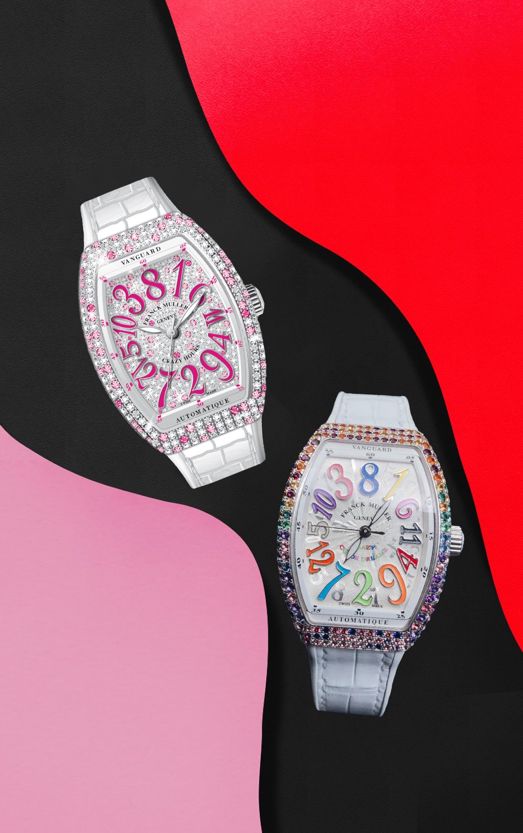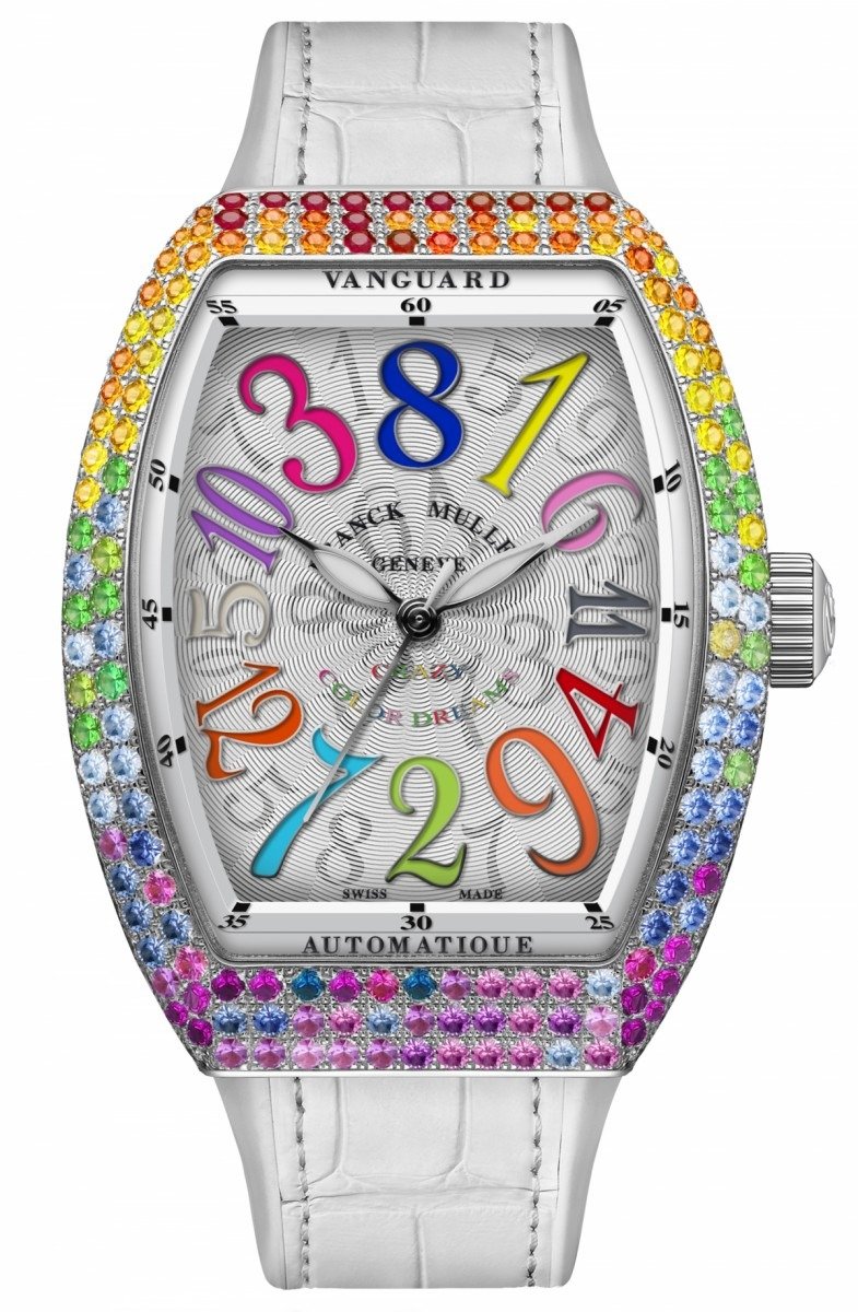 Franck Muller Vanguard Crazy Hours Lady,展現曲線美的弧形不銹鋼錶殼上鑲飾著299顆彩色寶石,它們沒有完全整齊地跟漸變色排列,但放眼望去不會覺得混亂,彩虹色調依然分明。白色錶盤上,彩色的浮雕數字時標與錶殼上的七彩寶石互相配合,配搭白色橡膠鱷魚皮錶帶,瑰麗動人。在2003年面世的Crazy Hours複雜功能腕錶,以突破傳統的方式顯示時間,數字時標的排列非順序,時針每隔60分鐘便會跳到下一個正確數字時標,而分針則傳統地沿著60分鐘外圈轉動以正常運行,Crazy Hour因而得名。腕錶內置MVD FM 2038-CH自動機芯,備有40小時動力貯存。