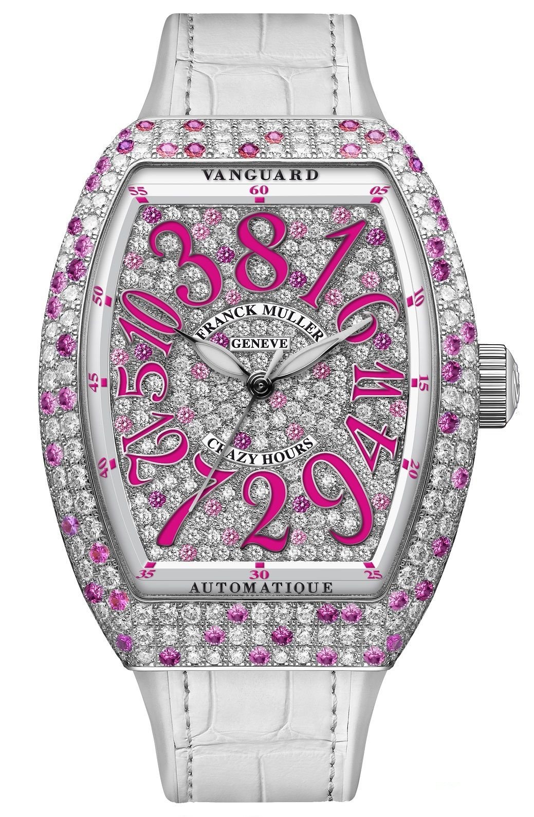 Vanguard Crazy Hours Lady腕錶則為高雅女性加添精緻趣味。錶盤上的浮雕數字時標與寶石仿如在時光中翩翩起舞,造型優雅迷人。錶盤合共鑲嵌逾200顆白鑽及80顆玫瑰寶石,與錶殼鑲嵌閃爍奪目的鑽石完美配合,像是粉紅糖果般漸層分佈,令腕錶更顯瑰麗典雅。閃耀鑽石搭配粉紅寶石點綴更顯鑽石的耀眼,活潑的桃紅色數字搭配寶石點綴讓少女心顯露無遺,此系列以突破傳統的方式顯示時間,旨在表達時間為一個抽象的概念,而時間的價值亦因人而異。Vanguard Crazy Hours 的數字時標以非順序顯示,時針每隔60分鐘便會跳到下一個正確數字時標。這款設計令人期待每59分鐘的來臨,亦為這款腕錶增添一抹攝人魅力。
