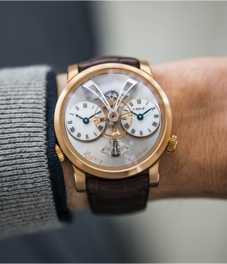 MB&F 創立的第七年,Legacy Machine 誕生,Legacy Machine No.1是對傳統製表業偉大創新者的致敬。當MaximilianBüsser開始幻想時,設想LM1:“如果我出生於1867年而不是1967年會發生什麼?在20世紀初期出現第一個腕錶,我想為手腕創作3D腕錶,沒有Grendizers,星球大戰或戰鬥機成為我的靈感,但我有懷錶,艾菲爾鐵塔和儒勒凡爾納,如果我製作比較傳統的機械時計腕錶它會是怎樣的?它必須是圓形的,它外觀會是典雅的圓形,配搭3D立體結構,總而言之Legacy Machine No.1是我的答案。“