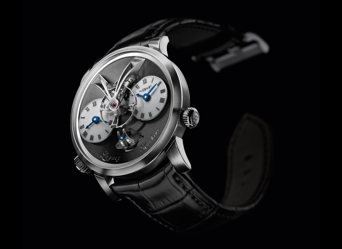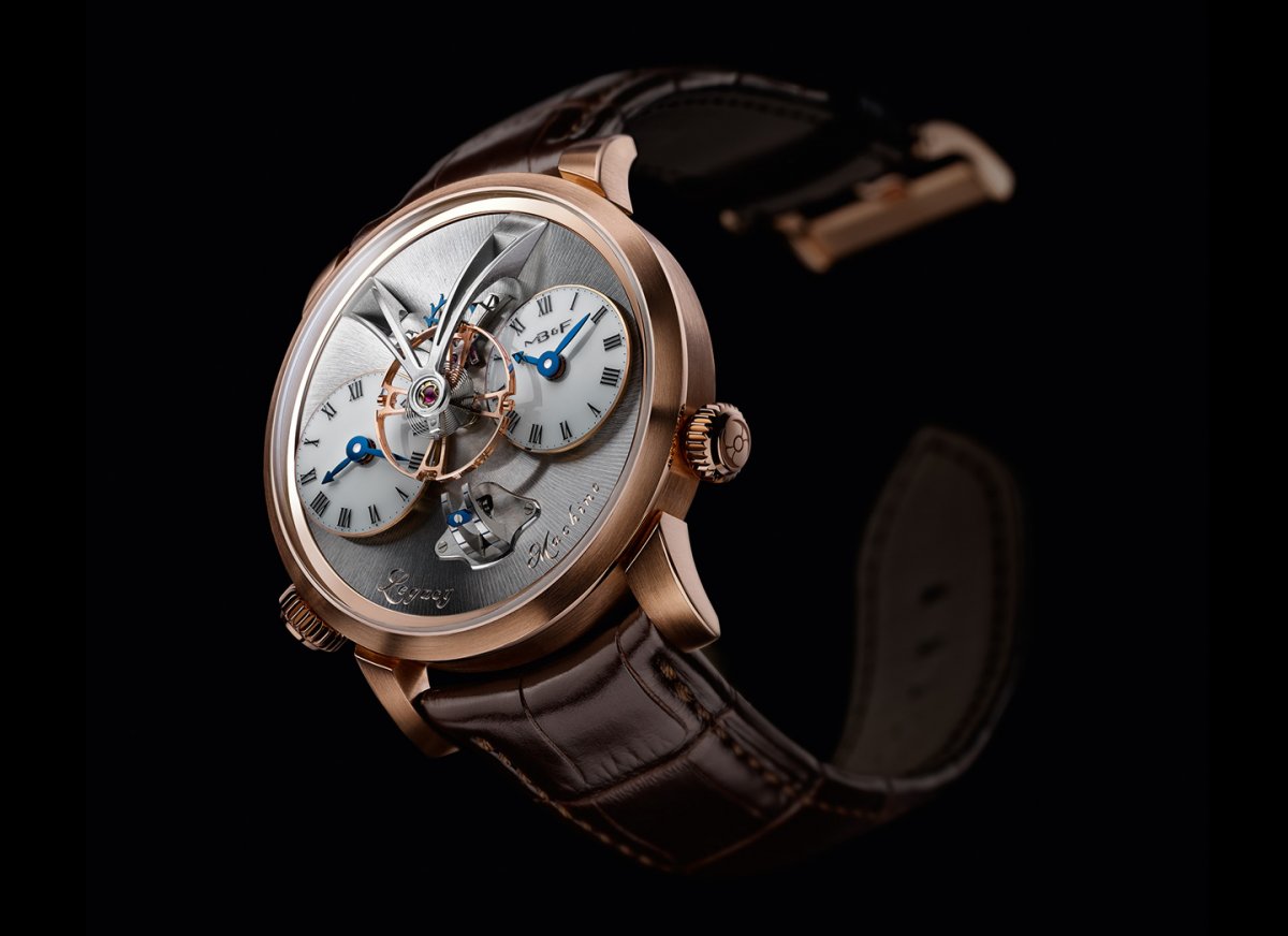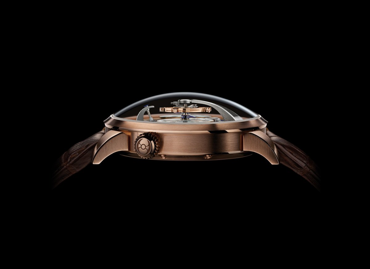 MB&F LM1 Legacy Machine N°1 (LM1 RG 18K 玫瑰金材質) 中央單一擒縱,輸出動力分別推動左右兩個時分指針盤