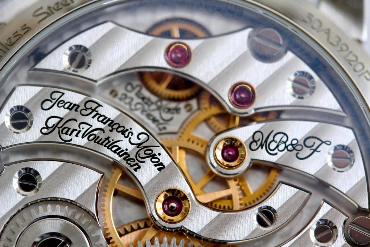 通過藍寶石底蓋可見的機芯是由Chronode的MB&F設計的,由Jean-François Mojon(他於2005年創立Chronode)和他的團隊設計,以及由獨立製表師Kari Voutilainen參與的美學設計。手工打造的拋光內部斜面,日內瓦波紋和手工雕刻。