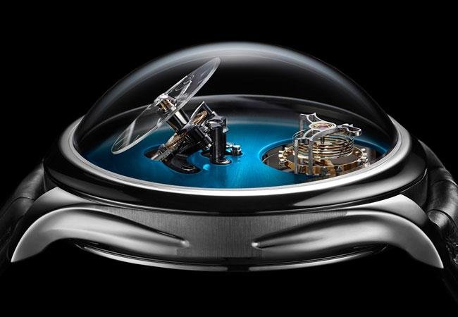 另一項傳承 MB&F 的經典特色則是傾斜小時和分鐘錶盤,為了將判讀時間的隱私完全保留給佩戴者,亨利慕時本次將小時與分鐘盤以 40 度傾斜設計,小錶盤安裝在圓錐齒輪系上,以確保扭力於兩平面之間順利傳遞。正如 Edouard Meylan 所言:「為了讓MB&F的世界擁有亨利慕時的風格, 透過藍寶石水晶小錶盤設計,小錶盤能够完美與背景融合,襯托出煙燻錶盤之美。