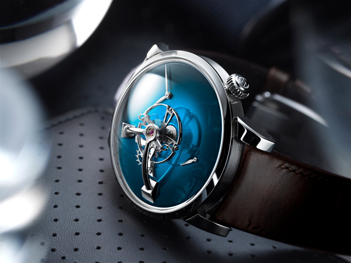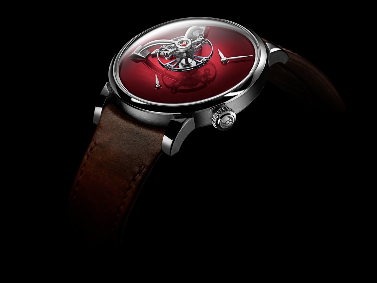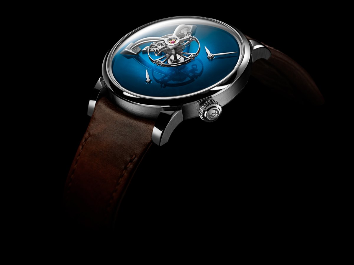 另一項傳承 MB&F 的經典特色則是傾斜小時和分鐘錶盤,為了將判讀時間的隱私完全保留給佩戴者,亨利慕時本次將小時與分鐘盤以 40 度傾斜設計,小錶盤安裝在圓錐齒輪系上,以確保扭力於兩平面之間順利傳遞。 正如 Edouard Meylan 所言:「為了讓MB&F的世界擁有亨利慕時的風格, 透過藍寶石水晶小錶盤設計,小錶盤能够完美與背景融合,襯托出煙燻錶盤之美。另外,為了維持此鐘錶藝術大作的純粹與優雅,我們將品牌標誌以浮水印的方式置於藍寶石水晶小錶盤上,藉此強調 腕錶個性以及與佩戴者之間的緊密聯繫。」H. MOSER X MB&F 勇創者陀飛輪腕錶共有五種版本,皆採用精鋼錶殼,搭配電光藍、宇宙綠、勃根地紅、Off-White灰色以及冰河藍五色煙燻錶盤。