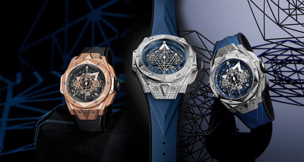 Maxime Plescia-Buchi 是著名紋身藝術家,同時也從事設計工作,開設有自己的 Sang Bleu 工作室(這也是腕表名字的由來)。Maxime 尤其喜愛以幾何及線條構組圖案,而Big Bang Sang Bleu 腕表也具備這重要元素。首作屬於基礎款時計,利用幾何圖案轉盤充當指針指示時間,新作是計時碼表,盤上有更多的功能顯示,但同樣採用了幾何指針,幾何圖案更由表盤延伸至表殼及至表帶。