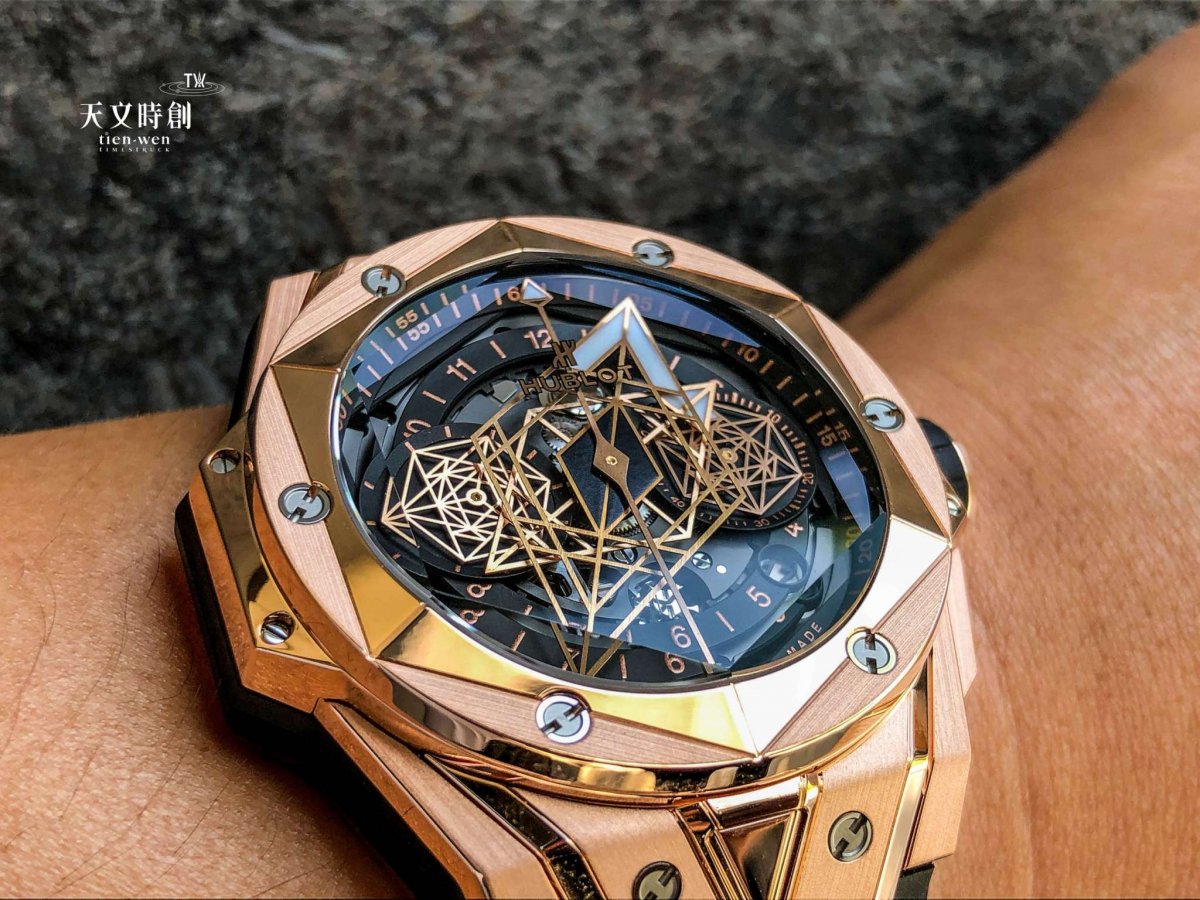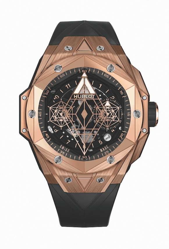 新款錶殼帶有繁複交錯的幾何線條,搭載宇舶HUBLOT自製HUB1240 Unico自動計時機芯;計時秒鐘透過中央指針加以顯示,計時分鐘則位在錶面兩個子面盤的右邊。