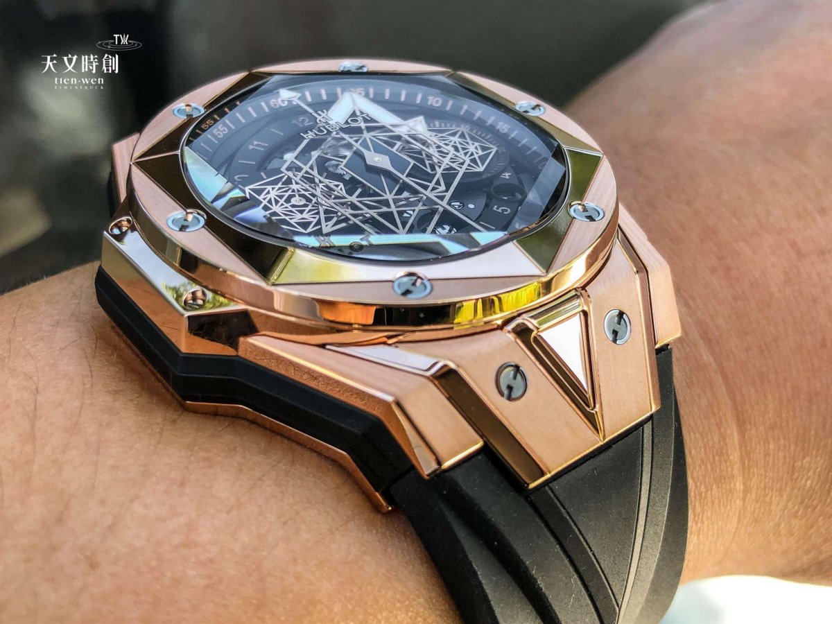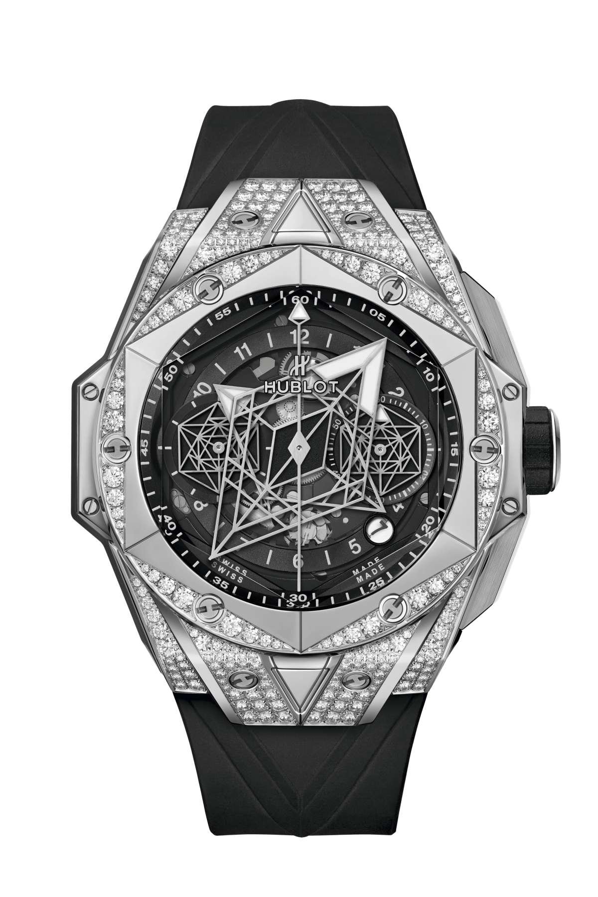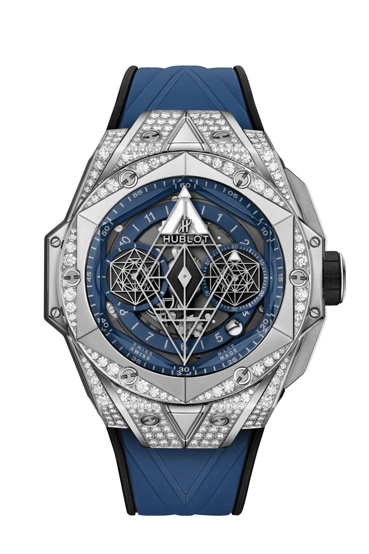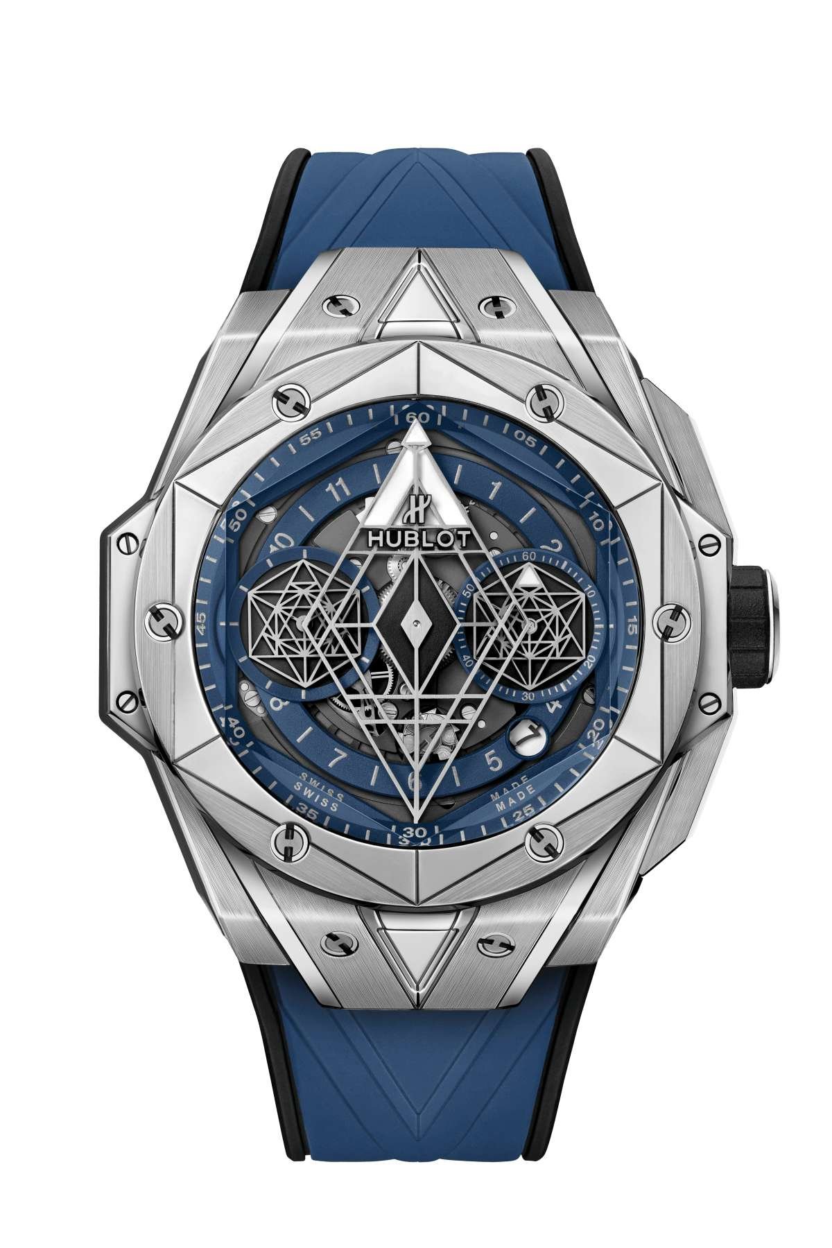 宇舶HUBLOT Big Bang Sang Bleu II以更具破壞性的方式將Maxime Plescia-Buchi的創作靈感轉化成立體的稜角和切面。作品的主題橫跨錶殼,一路切進錶款六角形的錶圈,然後雕刻出藍寶石水晶的錶鏡,整個錶頭透過這些幾何線條與指針形成對比,並且搭配了能夠自行快拆換裝的錶帶。錶盤採用開面設計,使用者可以直接看見底下的Unico機芯,它完美地融入整體結構,幾乎剛剛好填滿錶款45毫米外殼。
