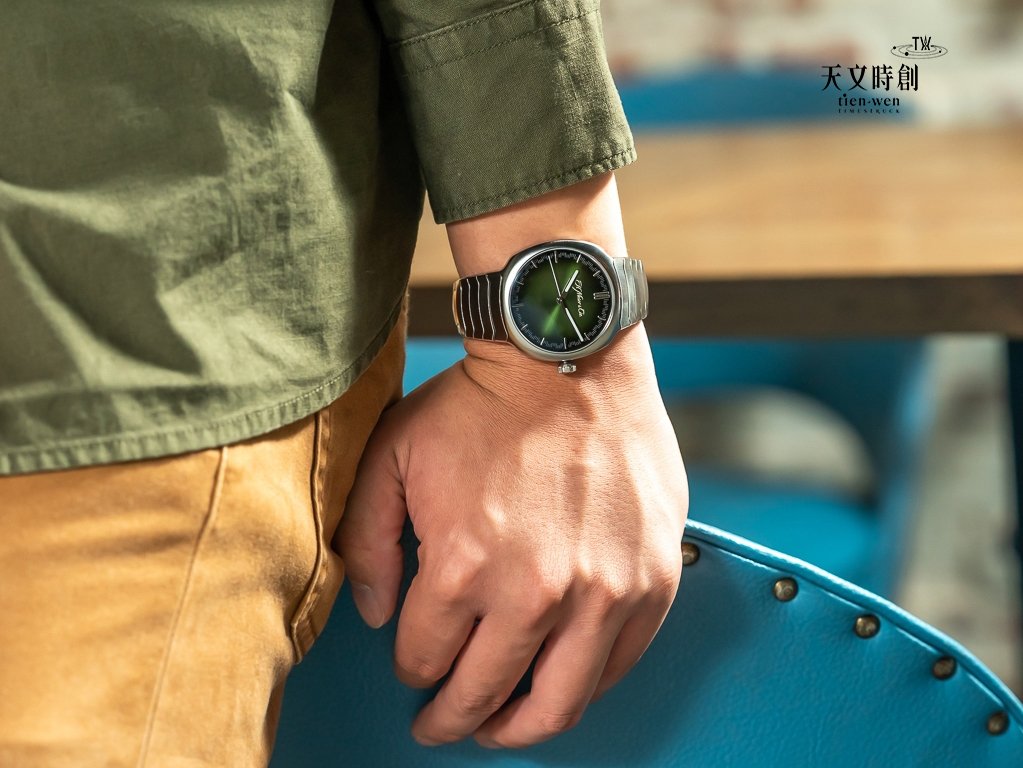 全新系列Steamliner疾速者大三針極光綠腕錶,一體成型的鍊帶自成一格,並兼具舒適度。