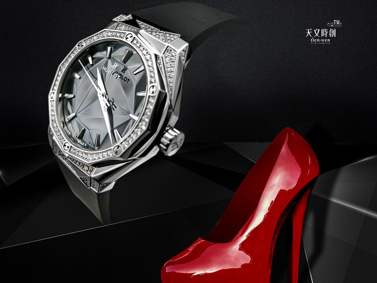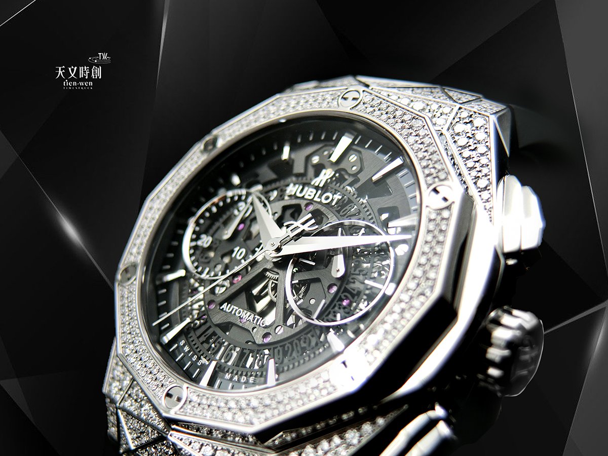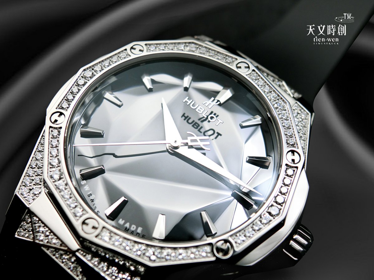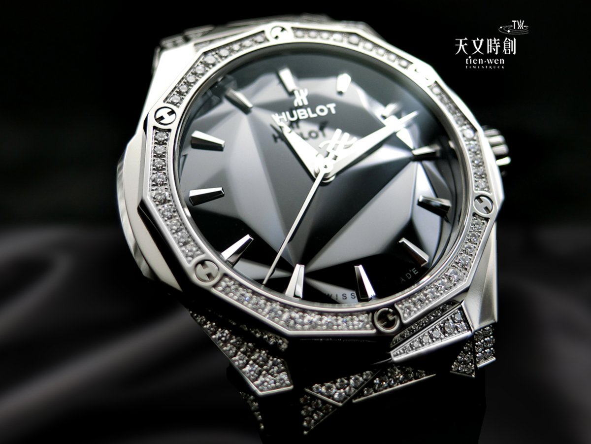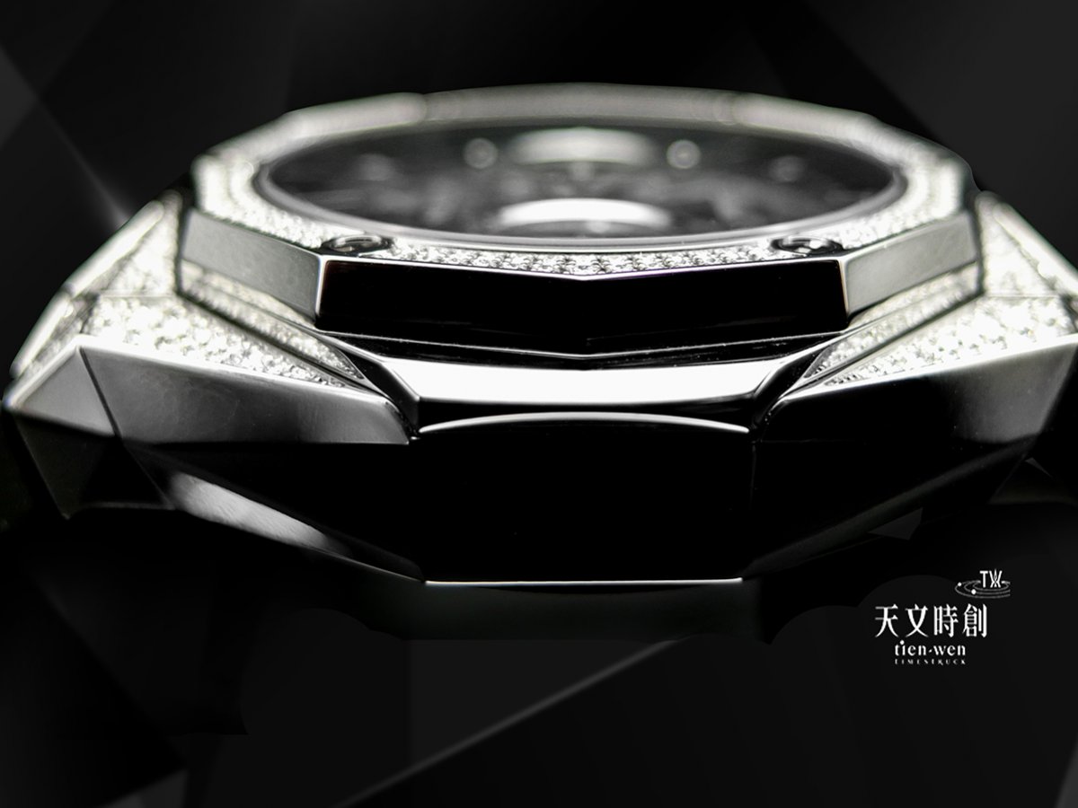 沿著十二邊形錶圈,鑲嵌著54顆鑽石,錶殼上則有112顆的不規則鑲鑽,因為鑽石是折射率最高的寶石,也襯托出了錶面上折線的雕刻面。