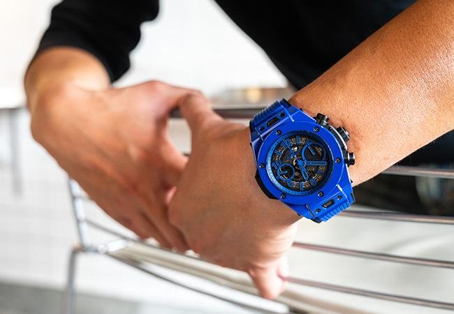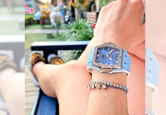 於是我走進店裡,越接近,越確信她戴的是宇舶HUBLOT的Spirit of Big Bang淺藍陶瓷鈦金屬鑲鑽腕錶。我再說一次,因為她跟她的錶實在太顯眼了。