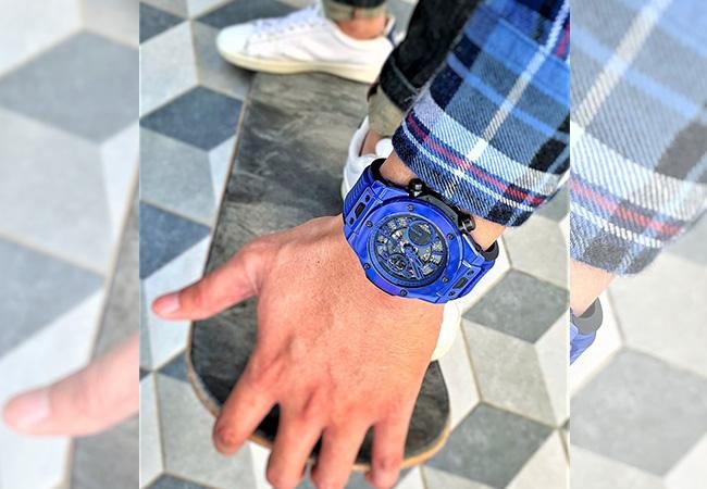 他這天換了一款錶,換成宇舶HUBLOT的Big Bang魔力藍陶瓷計時碼錶。