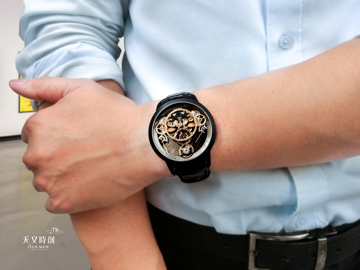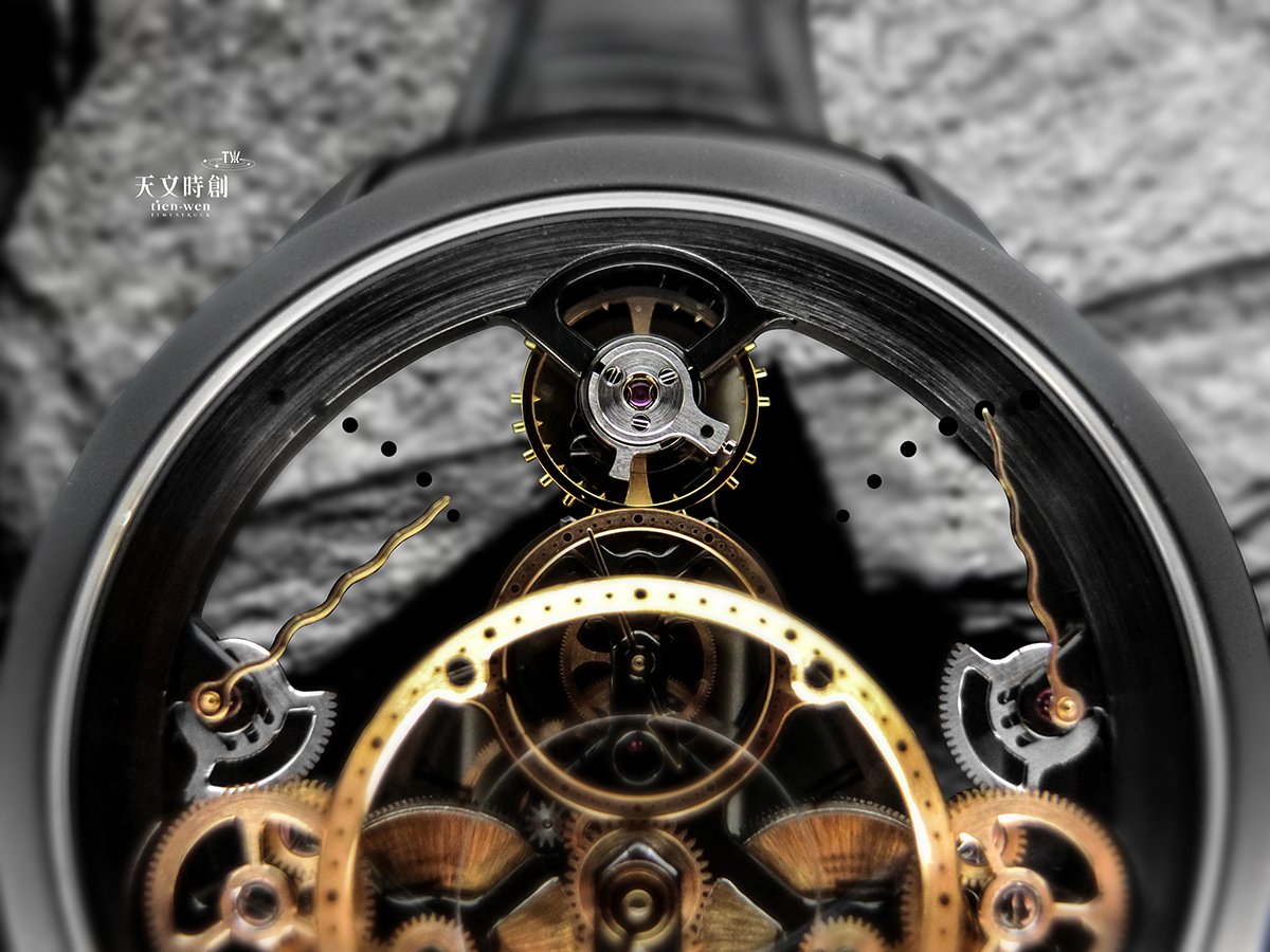 更有趣的地方在於鏤空的視覺呈現,在12點位置的擒縱系統的擺輪,3點還有9點動力儲存顯示,彷若懸浮空中,幾無遮蔽,視覺效果更是突出。在動力儲存顯示的部分,黑色圓點提示動力存能部分,則是列印在藍寶石水晶玻璃上,當耗費能量會先由左邊發條盒依次到右邊發條盒,兩根金色指針也會藉由下降來展示這個耗能,非常容易辨讀。所有部件在正反兩面的藍寶石水晶之間清晰可見,除了展現機械之美,其運轉作動的動態視覺也帶來極佳閱時樂趣。