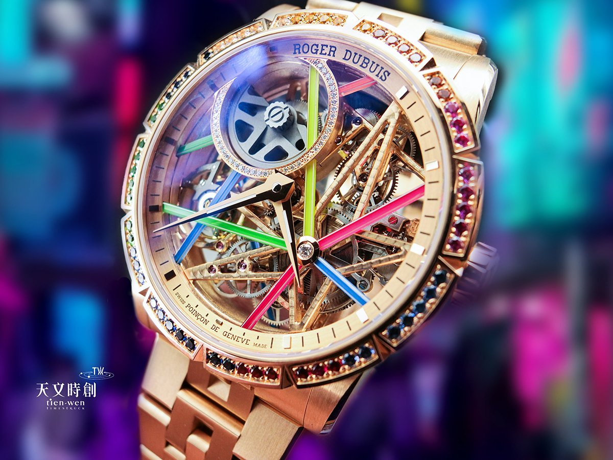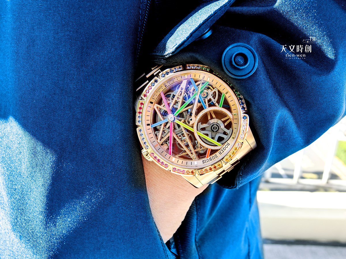 Excalibur Blacklight Rainbow玫瑰金鏤空自動上鍊腕錶,在Roger Dubuis 羅傑杜彼眾多的Excalibur王者Blacklight系列中,算是最凸顯特色的腕錶之一,不同於Blacklight Titanium Black在白天時的低調,Blacklight Rainbow玫瑰金在白日就可看到RD820SQ機芯線條的彩虹色彩,錶圈上的彩虹寶石也是不容忽視的焦點--錶圈鑲嵌紅寶石、藍寶石與黃、粉、橘色剛玉,更生動呈現城市活力。