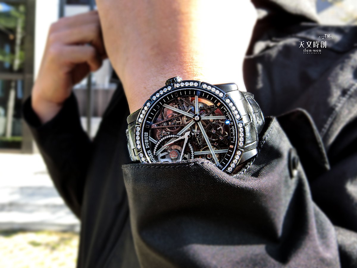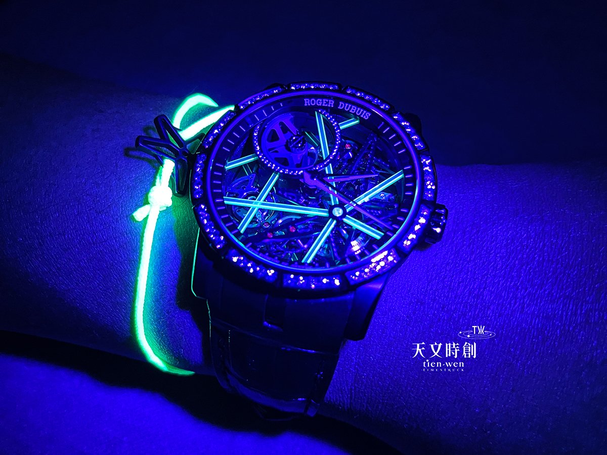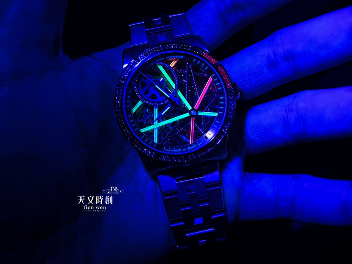 Roger Dubuis 羅傑杜彼Excalibur Blacklight Titanium Black DLC鈦金屬自動上鍊腕錶,在白天腕錶以黑、白、灰色調微妙展現出低調的冷酷氣息,但是一到深夜立刻轉換風格,透過紫外線燈照射,其機芯、盤緣與透明微型藍寶石結構迸發出萬花筒般的超凡色彩,異彩紛呈且活力四射。能夠有這樣的視覺效果,就得說到標誌性的RD820SQ 「Astral Skeleton 星辰鏤空」機芯,羅杰杜彼採用其著名的微型自動盤以強調機芯通透度;另外,鏤空的橋板上更採用透明的微型合成藍寶石結構技術,當此微型藍寶石結構在黑夜中透過紫外線照射而顯現出螢光柱條時,層次跟立體感會顯得非常鮮明,彷彿漂浮於錶殼中! 錶框上的鑽石璀璨光輝則進一步強化多重層次與角度,創造豐富的視覺效果。交錯堆疊的螢光線條傳達出當代雕塑美感的鏤空星型支架,透明藍寶石結構在一般光線跟UV光照射下,有著「頂級製錶技術」跟「鮮豔生活」兩個截然不同的藝術效果,除了更增添配戴趣味、也更彰顯出佩戴者的品味。