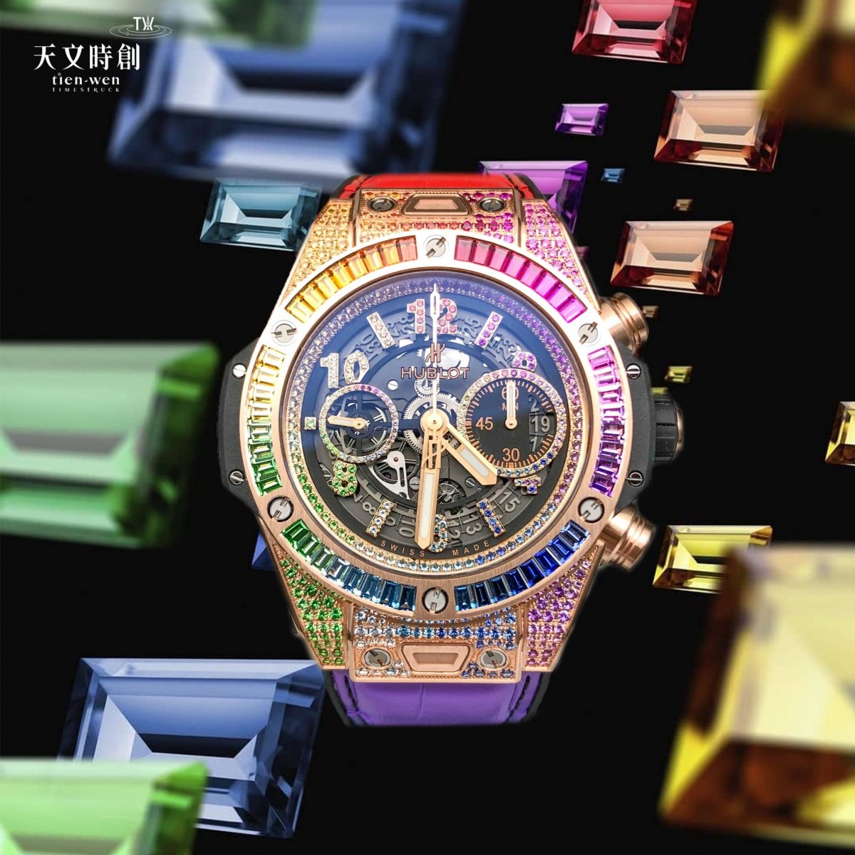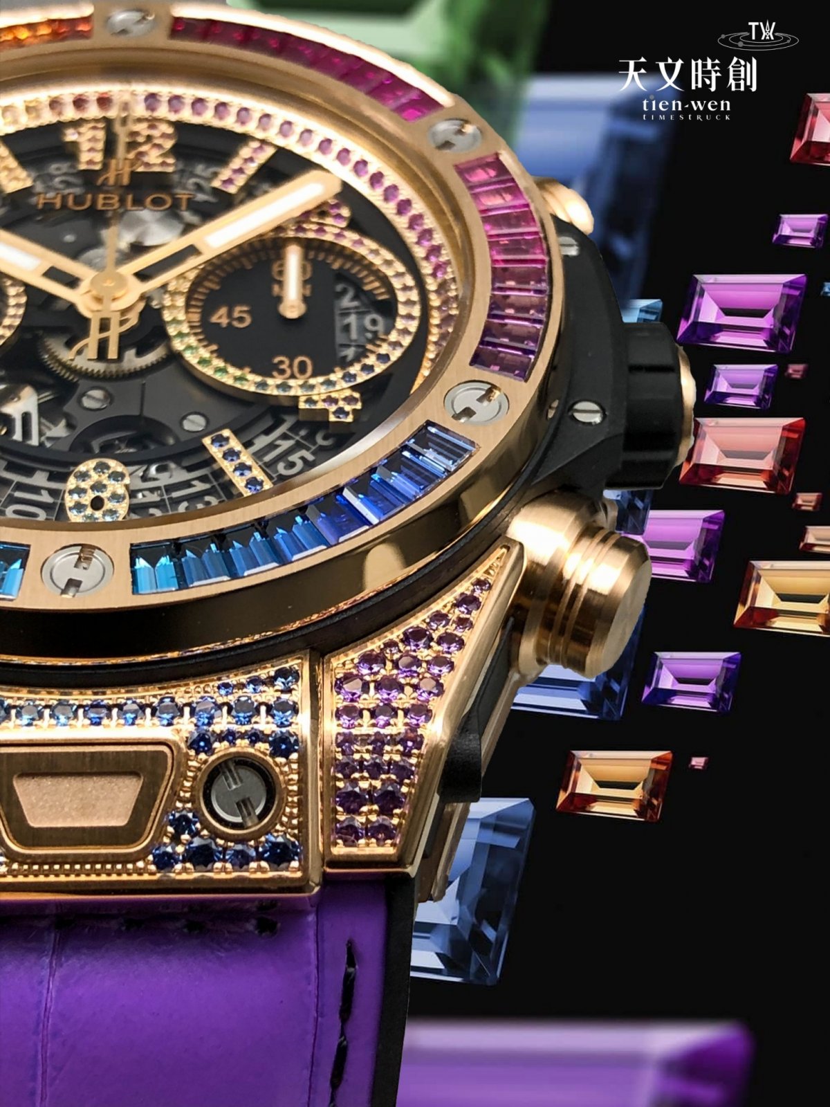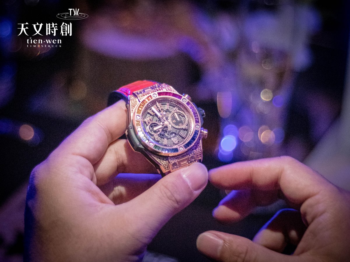 Hublot Big Bang Unico King Gold Rainbow 45mm彩虹寶石腕表上可見豐富多變的彩色寶石光芒