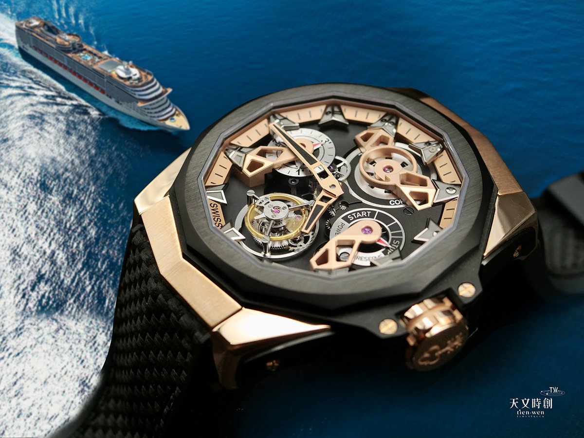 結合玫瑰金材質的錶殼與黑色PVD塗層鈦金屬錶圈,讓視覺上看起來厚實但配戴起來卻毫不感負擔,陽剛豪邁與手感間俐落動感同時展現。中間的時針與分針皆為鏤空的改良式太子妃式指針,與面盤的鏤空空間感相互呼應。三點鐘位置與九點鐘位置的副錶盤分別為動力儲存顯示與小秒針盤,十二點鐘為發條盒配置,六點鐘則是象徵船隻引擎轉動的陀飛輪。
