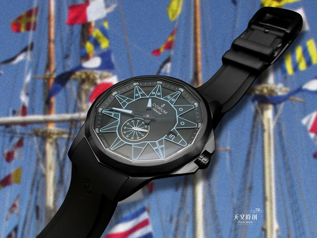 CORUM AD42 FULL BLACK以冷酷的黑配襯水藍色的航海旗時標和指針,使得視覺上更加立體