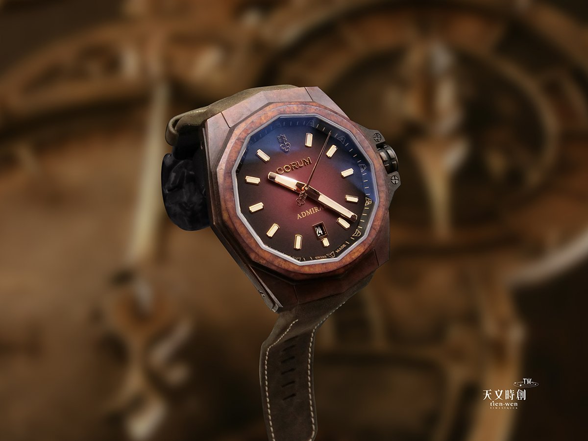 崑崙CORUM海軍上將Admiral AC-ONE 45 BRONZE青銅自動腕錶,搭配搶眼的煙燻酒紅色面盤,讓整只青銅腕錶更顯迷人質感