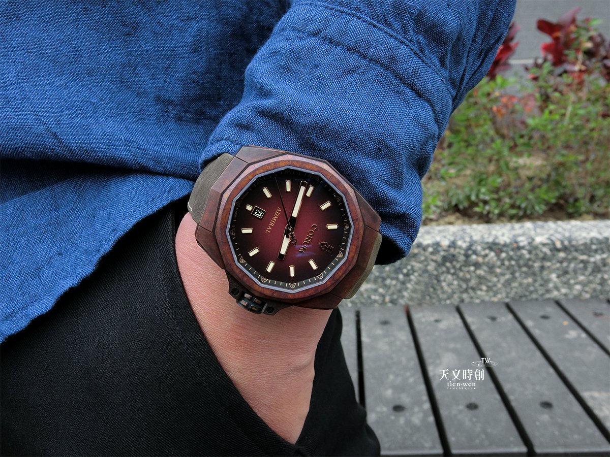 海軍上將Admiral AC-ONE 45 BRONZE運用青銅材質呼應系列的海洋精神,但特地另外將錶殼加工, 先行舊化處理,固定錶殼色澤,避免繼續氧化,就是為了怕有些錶主不一定會喜歡氧化後的色澤。經過處理後的舊化銅殼,呈現如同樹木般的有韻味,古樸質感,更別有一番氣質感。