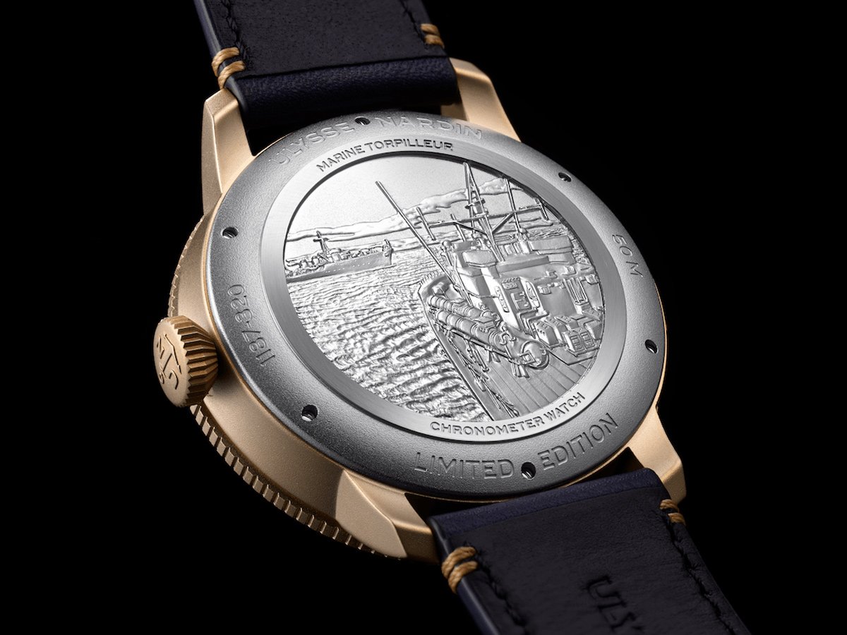 雅典錶航海系列領航者手錶青銅款錶背鐫刻一艘獨特的魚雷艇圖案。