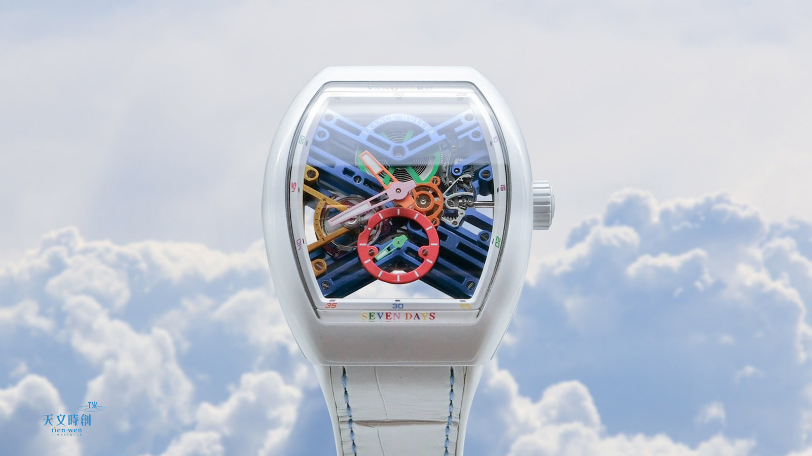 法蘭克·穆勒(法穆蘭)FRANCK MULLER推出的Vanguard 7 Days Power Reserve Skeleton搭載品牌自製FM 1740手上鍊機芯,精巧複雜的結構讓人歎為觀止。此機芯採用單一發條盒設計,尺寸規格並沒有特別的做大,而是此用了18,000次/小時的低振頻對於延長動力保存,讓腕錶有高達7日的動力儲存。除了長時間的動力儲存之外,對稱的鏤空設計模式,讓機芯極具有建築感,錶橋造型和打磨都顯示製錶師的高超工藝,除此之外還採用了豐富的色彩來點綴腕錶,例如發條盒是草地綠色、擒縱系統下方的夾板塗抹亮面紫色,其他像是橘色時針、桃紅色分針、6點方向紅色的小秒盤刻度,以及動力儲存顯示的黃色刻度等,都讓這款錶的正面充滿令人意亂情迷的色彩魅力。除了鏤空面盤的機芯配置紛色彩之外,面盤外緣的分鐘刻度、系列字樣與6點鐘方向的「SEVEN DAYS」7日動力儲存字樣也都用上了豐富的色彩,讓純淨的白色錶殼看起來就像白雲包裹著美豔的彩虹。