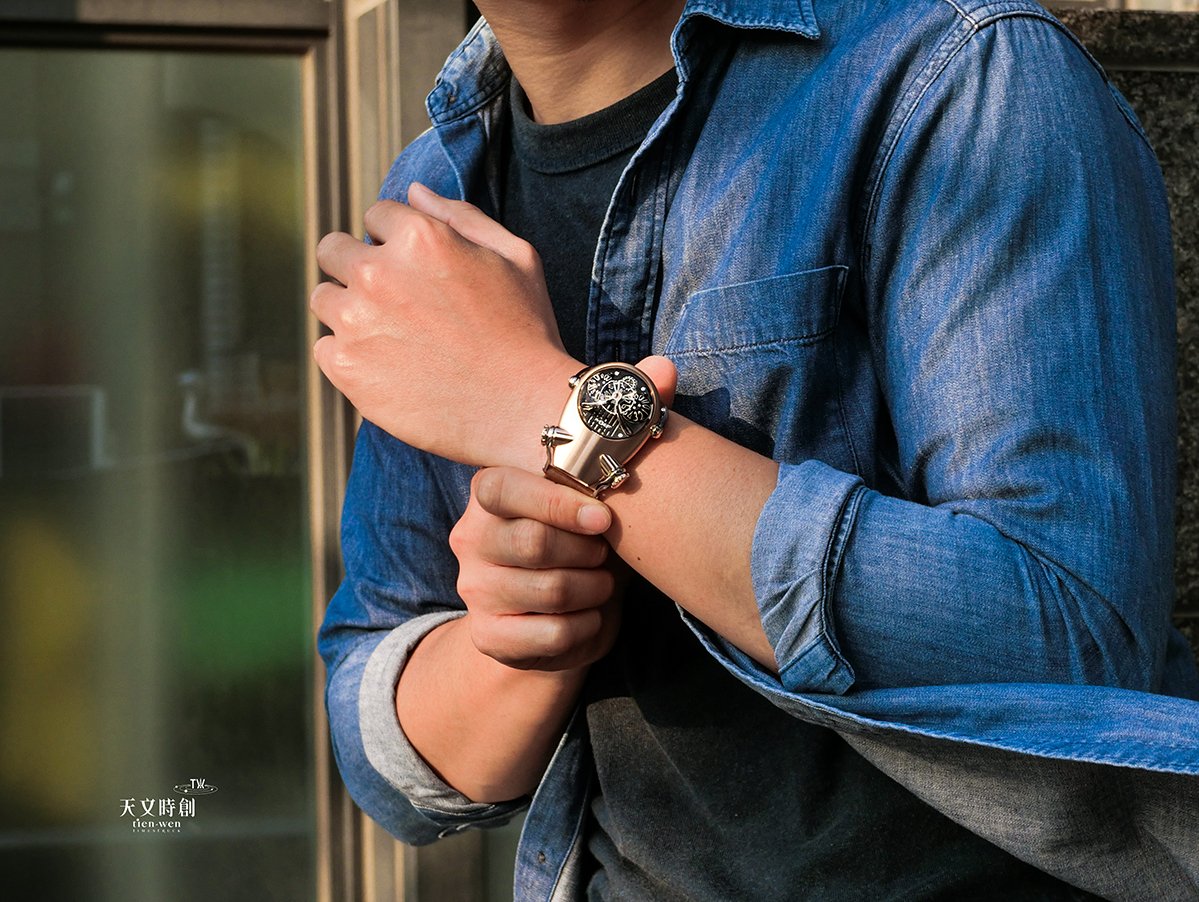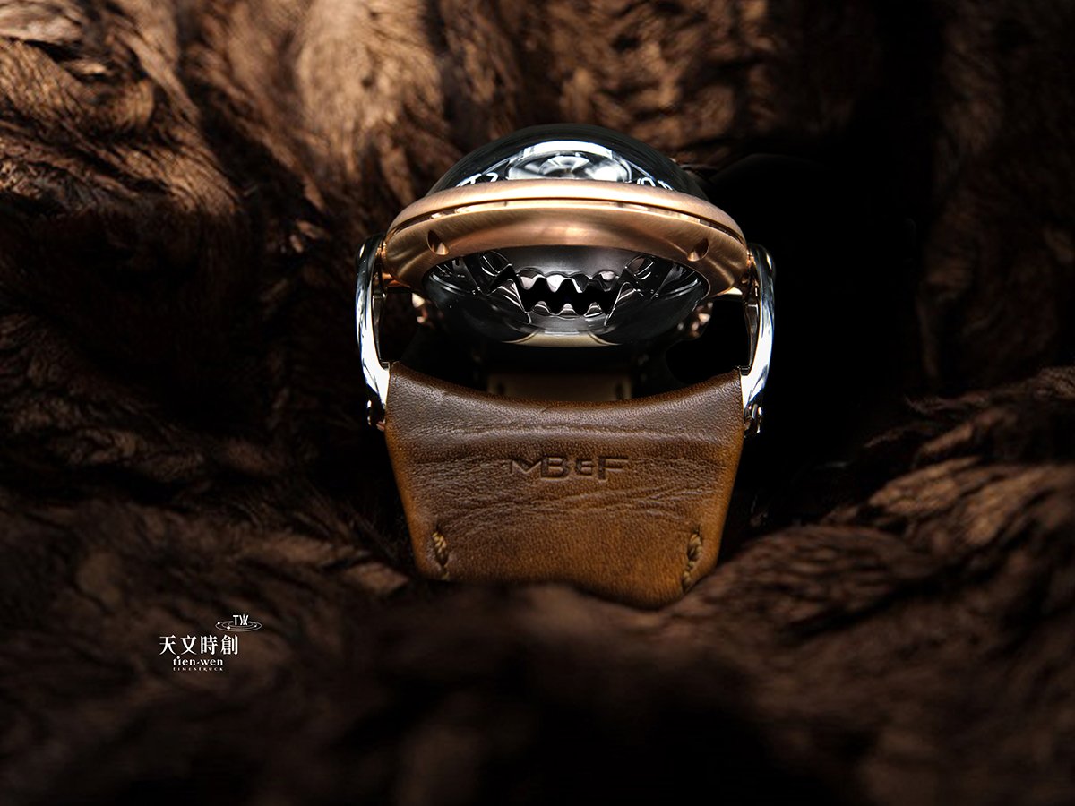 MB&F創辦人Maximilian Büsser (Max) 則是將鬥牛犬幾個特質,深刻地內化到了這只腕錶裡。首先,這只腕錶有著醒目的大頭與四肢,從側面看過去,四個前長後短、可調整角度的錶耳就像四肢一樣,且「後腿」錶耳還略為健壯,與鬥牛犬特徵相符,MB&F又再一次的給人們展現型態上的完美轉換。