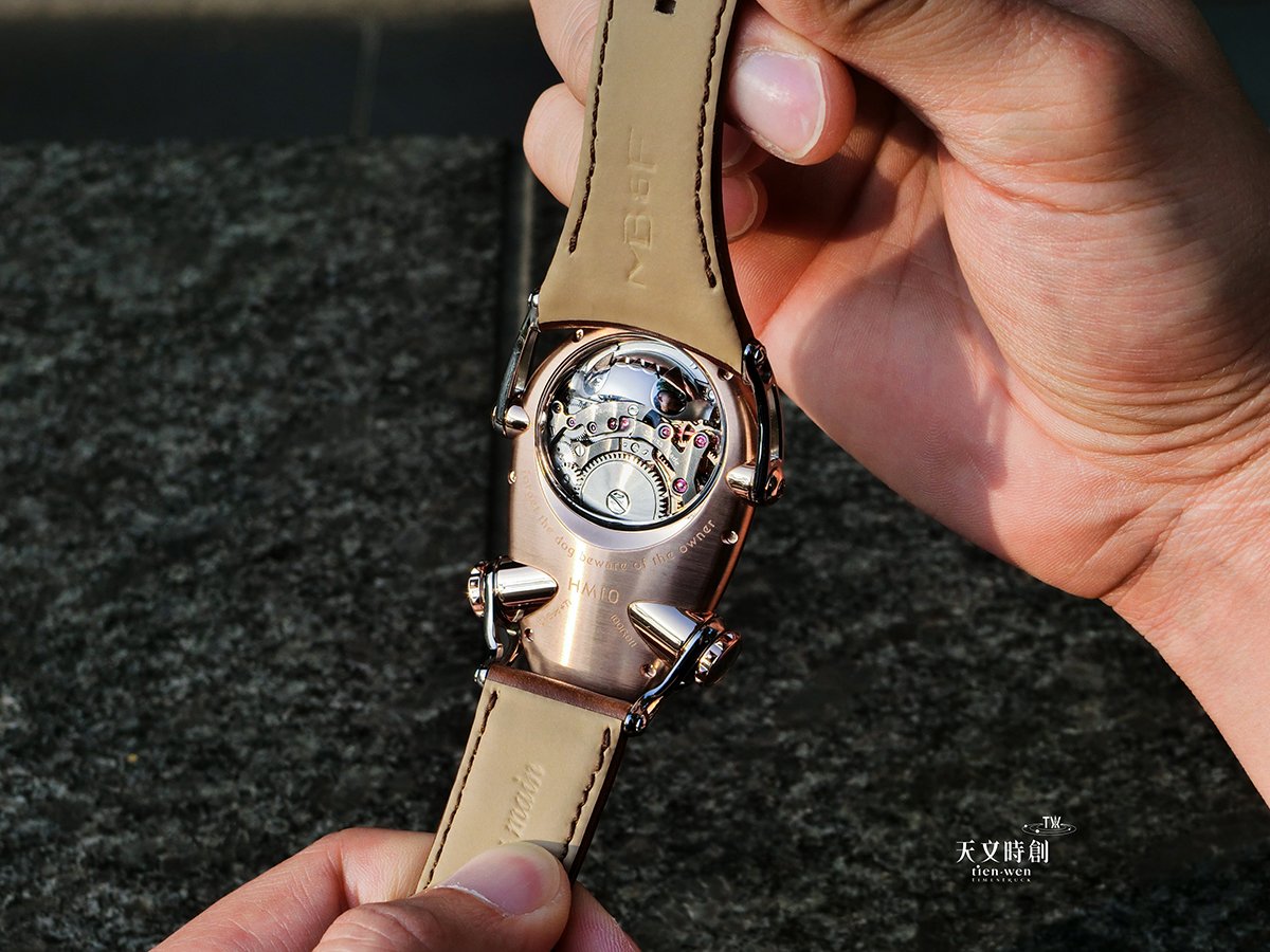 HM10 BULLDOG/54mm x 45mm x 24mm/18K 5N+玫瑰金錶殼/自製手動上鍊機芯/45 小時動力儲存/左右側半圓形小時錶盤、 3D 立體動力儲存顯示
