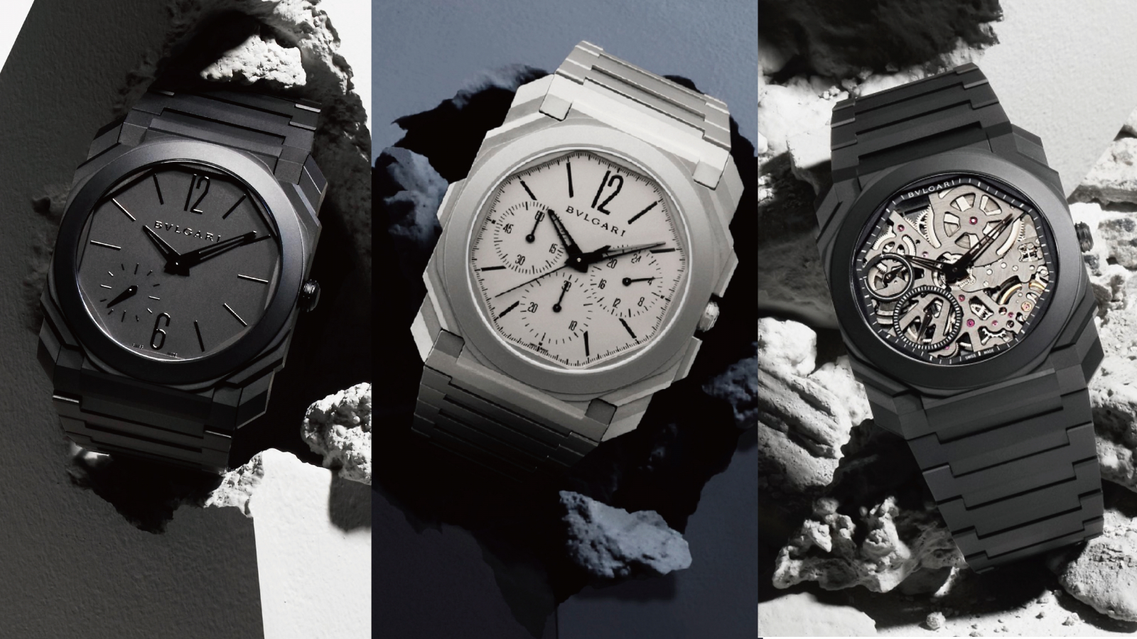 Bvlgari Octo寶格麗超薄腕錶 左 小三針灰陶瓷 中 超薄GMT 右 鏤空黑陶瓷