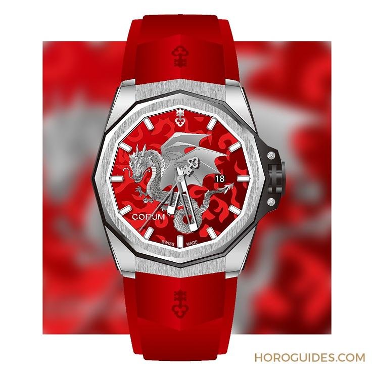 這次以AC-One錶殼造型為基礎所推出的三款限量腕錶,其中一只將中世紀時被視為神物的龍刻畫在面盤上。當時的寓言故事常將龍描述為具有翅膀,能夠翱翔於天際的神物。崑崙錶以此為靈感,在面盤上壓印出一隻背部長著翅膀,在天空張牙舞爪盤旋的巨龍,搭配有如像巨龍噴出的火焰般鮮紅的面盤。最經典的十二邊形錶殼則在錶圈和錶耳融入許多稜角使線條更銳利,而錶耳的表面和錶圈側面分別經過拋光打磨和拉絲細紋兩種處理方式,以不同的表面質感凸顯層次,讓整只腕錶更顯立體。