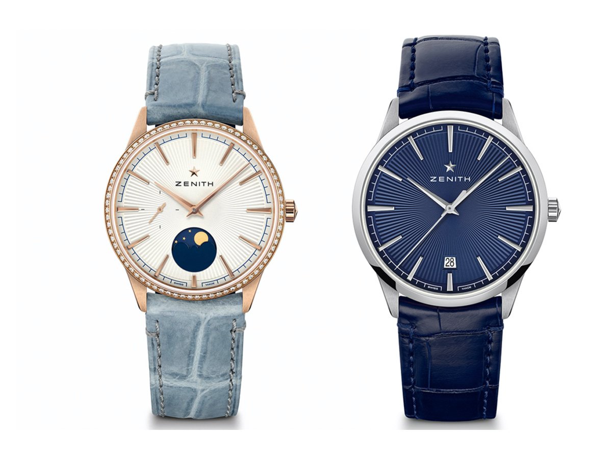 Elite今年在面盤上做出有別於以往的素面呈現,在錶面以機刻方式加入放射紋,錶殼設計也經過調整,功能上有月相和大三針日期、兩款的尺寸都有36mm和40.5mm,ZENITH真力時也順理成章把它們定位成對錶來搭配,為基本款加入新的變化型態。