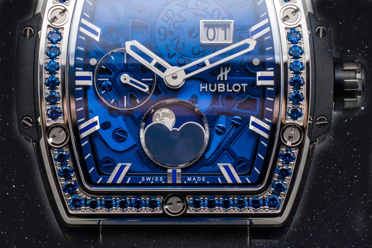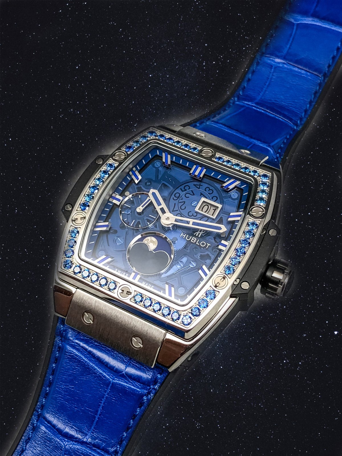 為了強調多重層次與幾何造型,全新Spirit of Big Bang Moonphase月相錶採用緞面處理的鈦金屬或王金,與色彩鮮艷的平滑表面,兩者抛磨技法相互交錯,錶圈上則鑲嵌48顆藍色藍寶石。這是一場鐘錶機械與複雜功能的月下狂想曲,等待你來發掘月球背後的祕密。