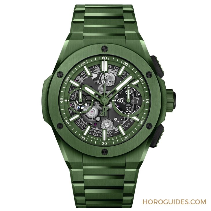 Hublot從亞馬遜熱帶雨林的自然景觀汲取靈感,為Integral陶瓷鍊帶計時碼錶帶來一場叢林野戰就要展開般的豪邁性格。綠色在鐘錶界的熱門程度還需多加贅述嗎?而且還是陶瓷鍊帶款,必收!