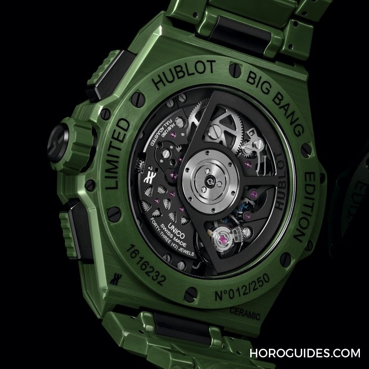 透過透明底蓋可欣賞到HUB1280 Unico自動上鍊計時機芯。叢林綠款的自動盤以鍍黑鈦金屬打造,營造出內外一致的整體美感。