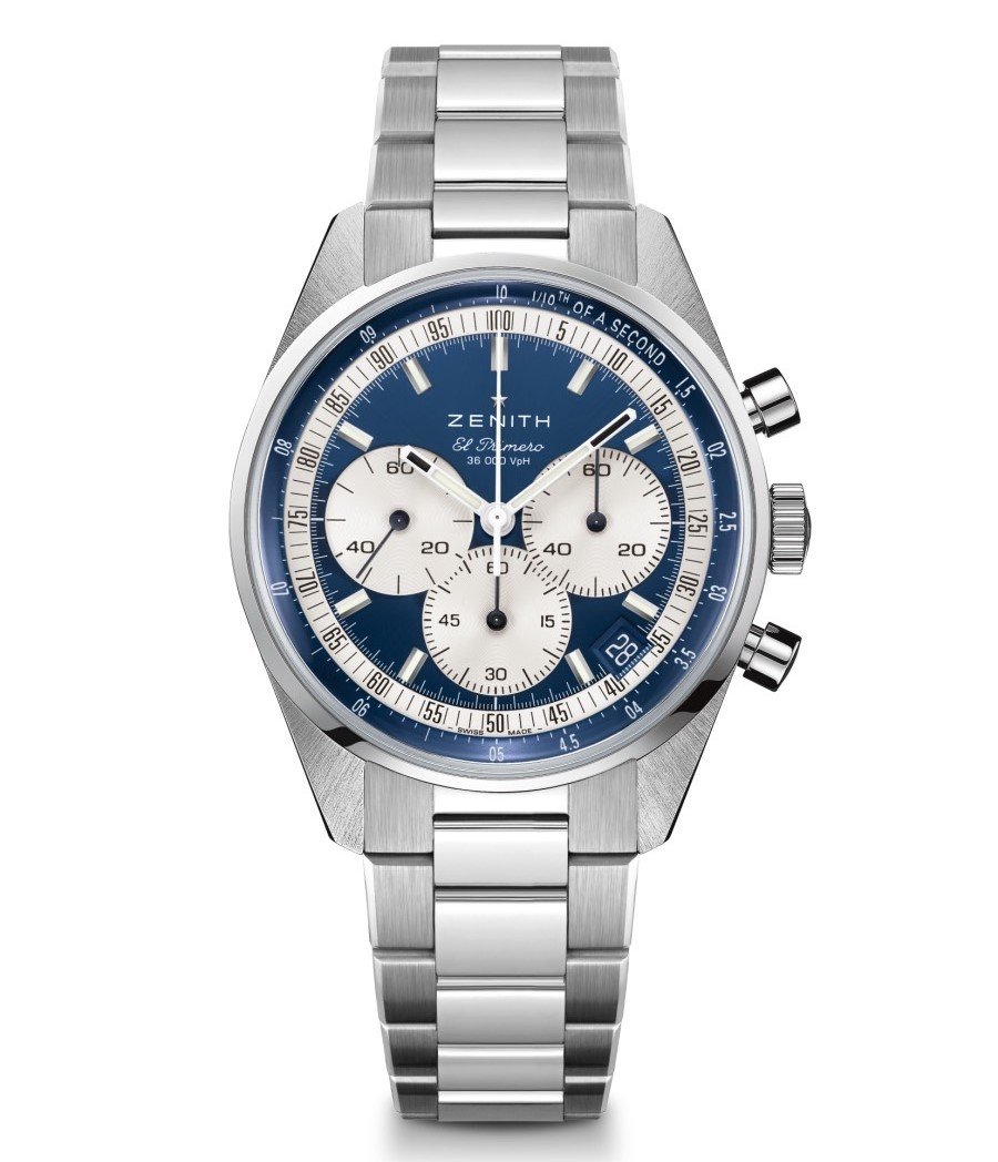 真力時這一款Chronomaster Original,外型上復刻了1969年的A386錶款,但內在則搭載21世紀的全新一代 El Primero 機芯,而這個反熊貓面盤的「真力時藍」錶款,則是只有在專賣店才買得到的限定款式。