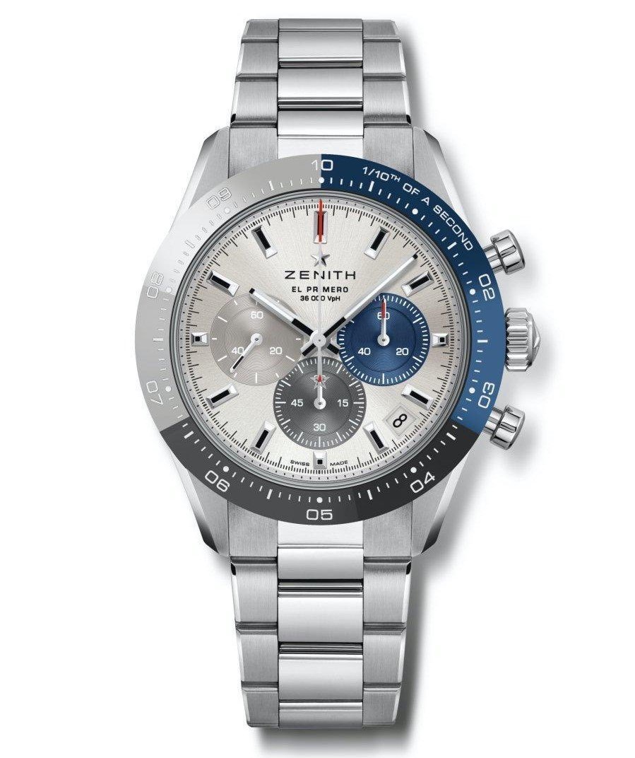 而畫面中這枚「真力時藍」面盤的特別版本,是僅在品牌專賣店銷售的限定版本。整個面盤呈現閃亮的藍色,計時盤則改用不同色階的灰色,巧妙改變三色錶盤的視覺效果,非常有特色。