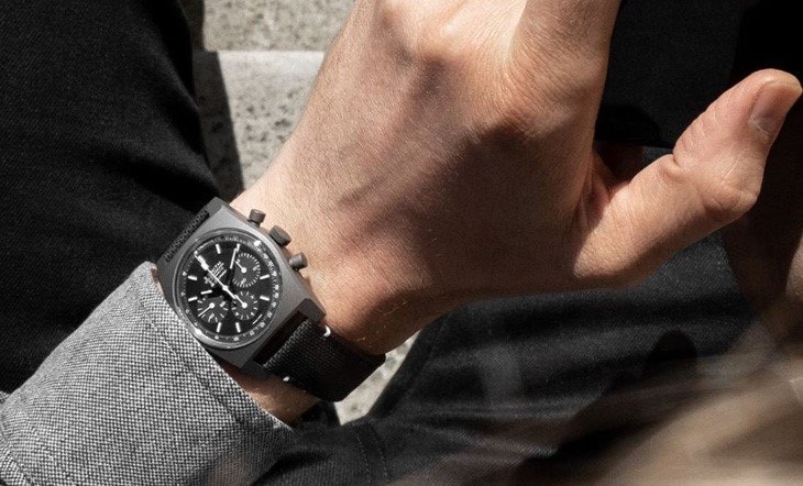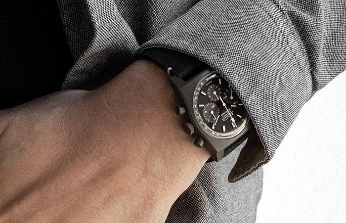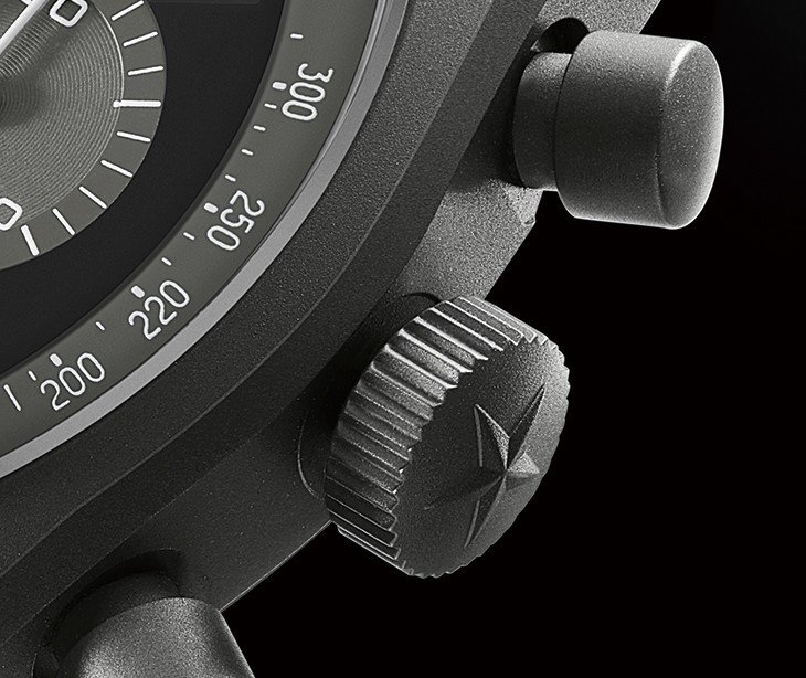 Revival Shadow 腕錶配備灰色計時盤和測速刻度,與深邃黑色的啞光錶盤形成微妙對比,讓人一眼辨識,清晰易讀