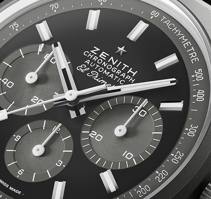 不同於傳統以黑色塗層處理的不鏽鋼物料,ZENITH採用微噴砂工藝處理鈦金屬,這種輕盈耐用的金屬物料經完全啞光打磨處理後,釋放出深灰色光澤。另外與1970年製作的搭載手動上鍊計時機芯的原型錶不同,此款Chronomaster Revival Shadow腕錶搭載深受歡迎且迄今為止最多產的El Primero自動上鍊計時機芯,並通過透明底蓋使機芯一覽無遺。