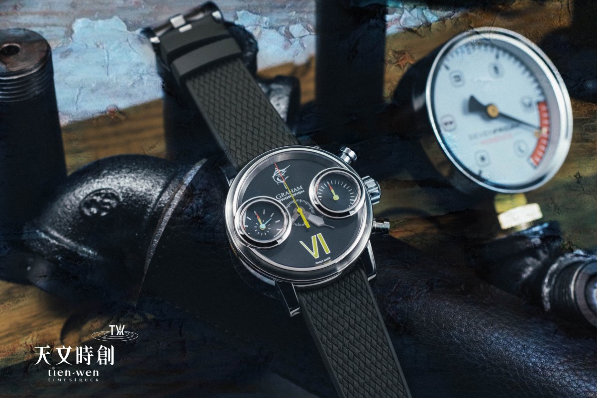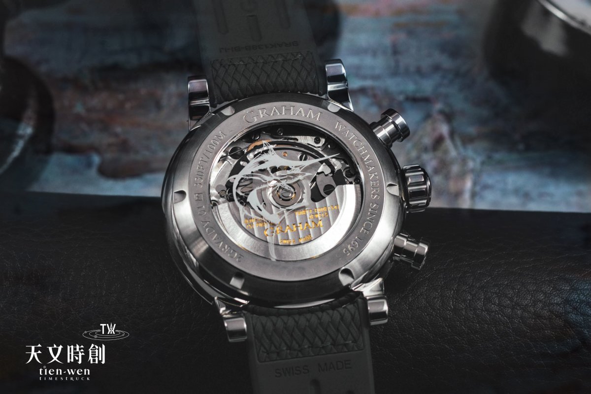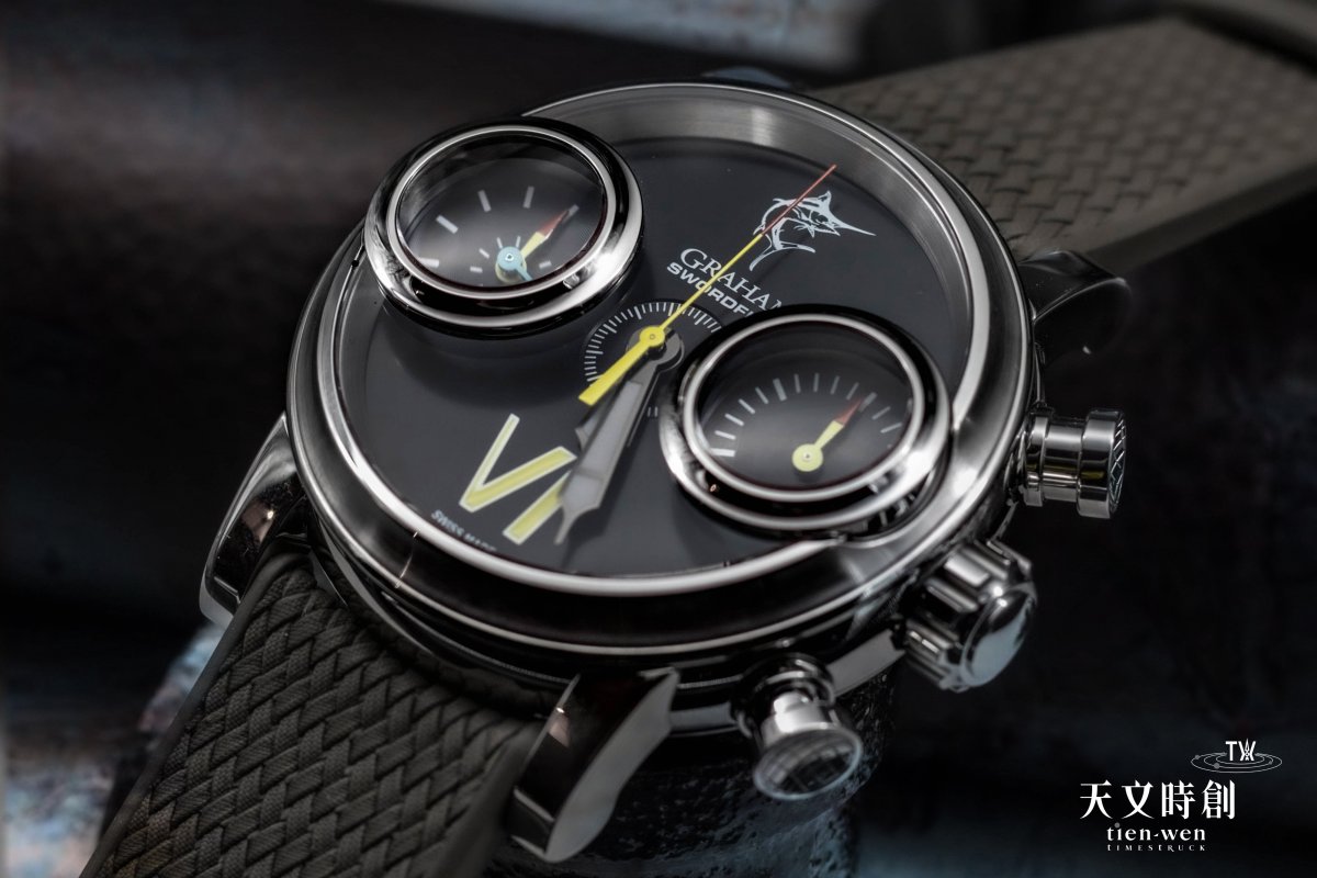 直徑46mm充滿存在感的錶殼,對許多品牌而言算是相當巨大,讓人一眼就印象深刻。雙眼計時碼錶功能,難得有品牌用20%的放大鏡將計時副錶盤做得如此巨大,彷彿兩顆魚眼,有老花眼的也可以看得清清楚楚。不過以「劍魚」為題的情況下,將焦點放在「計時」正好強調劍魚的「速度」與腕錶之間的連結。今年Graham也特別推出Swordfish Steel 與Swordfish Bronze兩款全新限量作品。