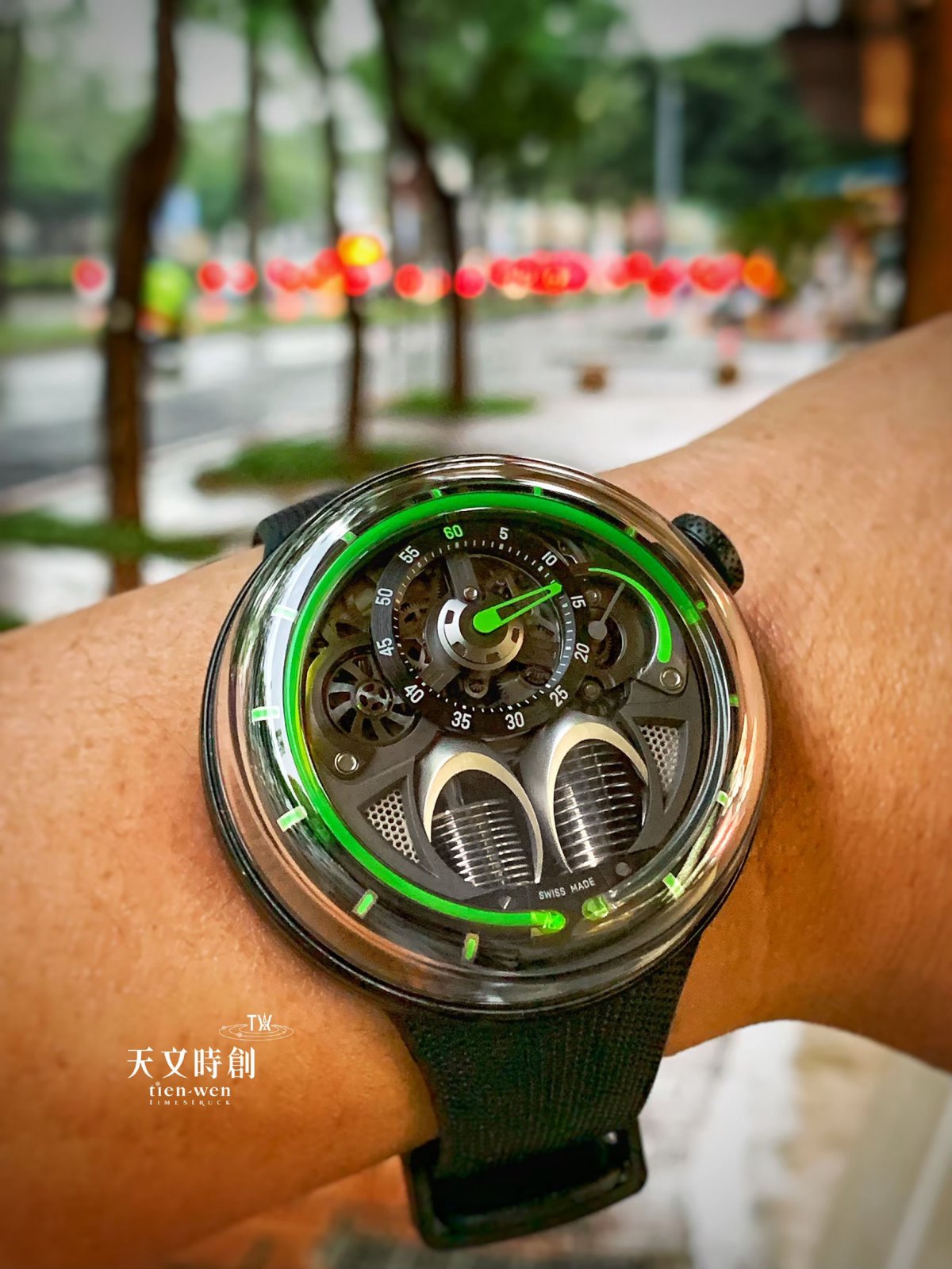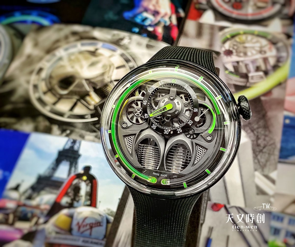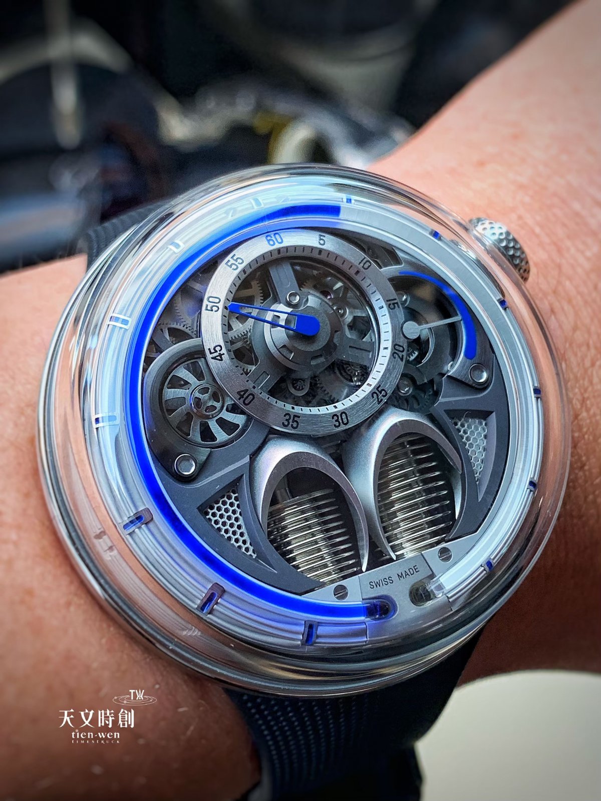 HYT H1.0這次表現得更有科幻感,加入太空船元素,幫浦蓋的設計彷彿火箭後燃器一般。推出銀、黑、碳灰色三種錶殼,分別搭配藍、綠,以及紅色的顯時液體版本。48.8mm/不鏽鋼/NTD 1,780,000