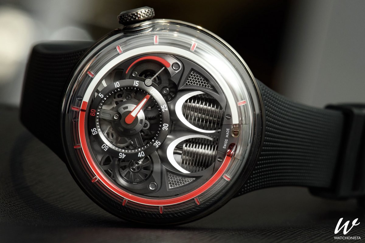 H0 的表盤換上了飾有刻度幼線的大塊表盤,而顯示兩個風箱狀儲液槽的視窗變成兩個長形小窗,並沒有了 6 時位的蓋子。新款H1.0腕錶面盤設計更具層次,顯露更多機芯結構,彰顯由裡而外的科技感。錶殼的深曲面造型,以及波紋抽取器的剪切線條,在視覺上營造衝突的效果,創造動力澎派的氛圍;而錶殼外緣以鏤空數字嵌入深凹槽的設計,更生動地呈現出時間的流動感。