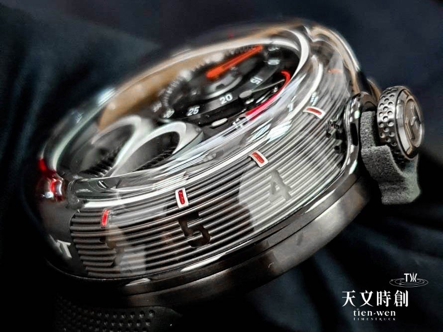 HYT H1.0腕表側面也以生動的形式展現,鏤空數字嵌入錶殼外緣的深凹槽