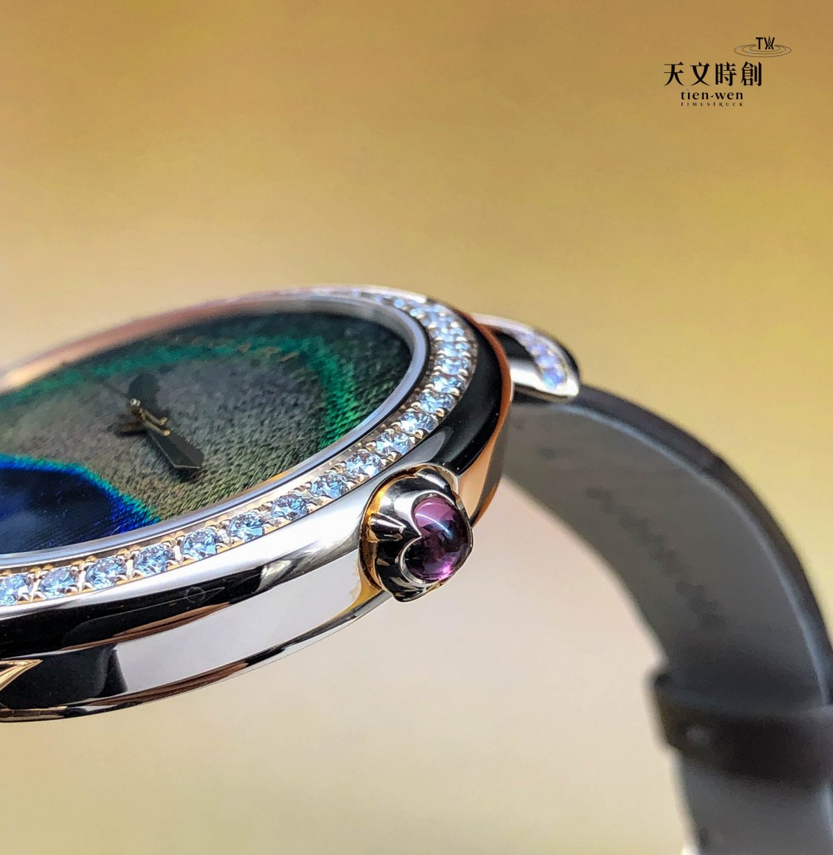 以天然孔雀羽毛製作的錶盤,每枚都是獨一無二的羽毛