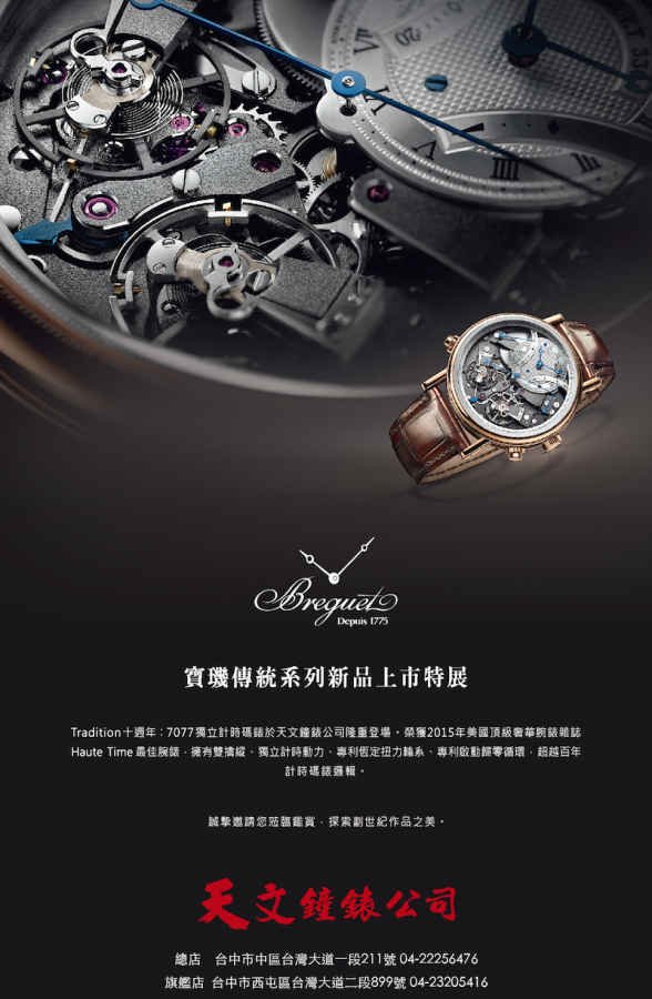 201604-18 天文鐘錶 與 Breguet 共同舉辦 Tradition 系列新品特展,敬邀您鑑賞! 天文鐘錶 與 Breguet 共同舉辦 Tradition 系列新品特展.邀您一同展開時光旅程,跨越時空與界線,以扣人心弦的樂章向寶璣的回憶致敬. 共同來探索劃世紀經典作品之美:7077獨立計時碼錶、7047芝麻鏈陀飛輪、7067兩地時間等....其他經典之作。 天文鐘錶公司 敬邀您鑑賞 分享到: