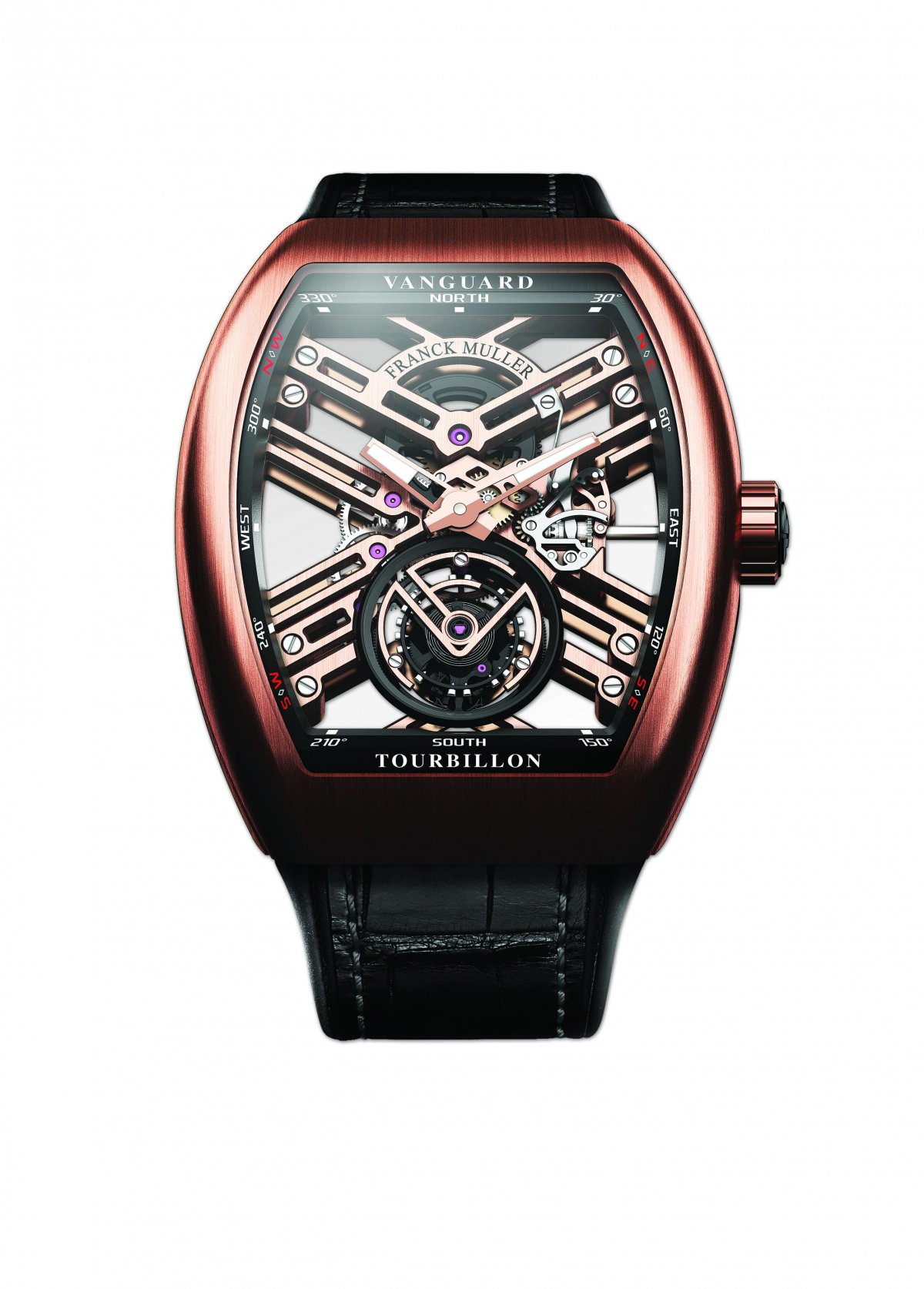 全新Vanguard Skeleton陀飛輪腕錶系列以精妙的鏤空設計,散發沉實而不失獨特的氣質,兼具動感與現代風範。腕錶的錶橋經手工完美拋光,錶廠自製機芯盡入眼簾。Vanguard Skeleton陀飛輪腕錶完全由FRANCK MULLER原廠設計及製造,彰顯品牌獨有的工藝熱忱與藝術細節。鏤空錶橋經精心設計以突出腕錶的結構,令人一見傾心。陀飛輪的上錶橋部分飾有品牌的縮寫字母,為腕錶展現無限活力。