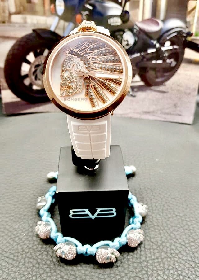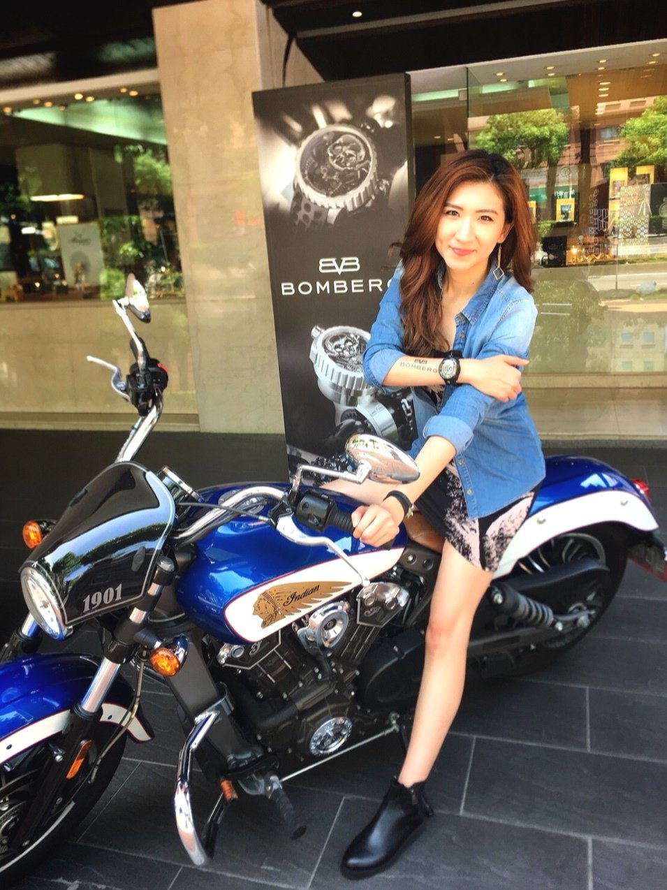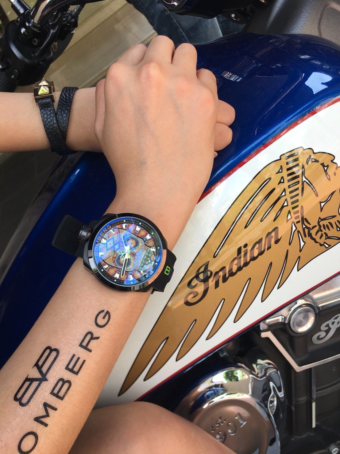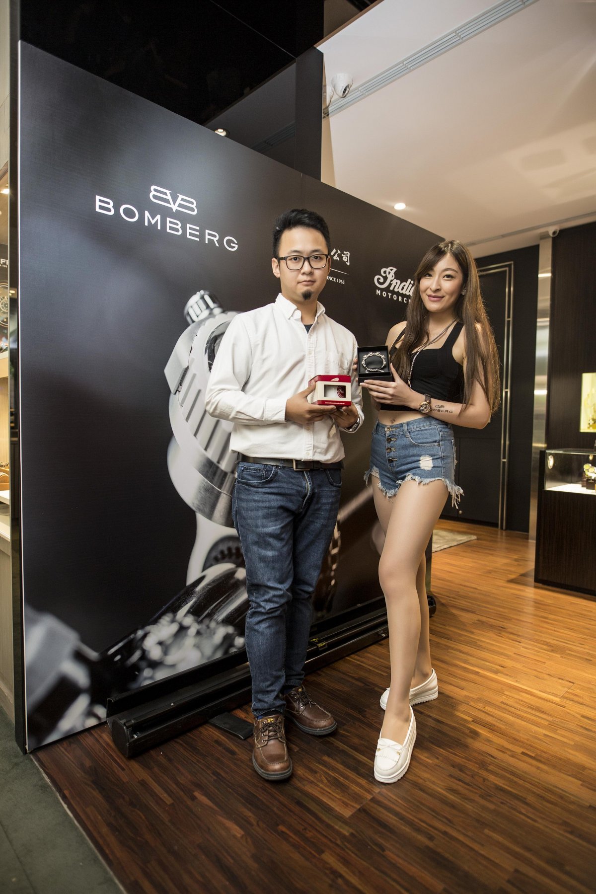 天文鐘錶公司市政旗艦店銷售總監 Ashley Chen 當日以繽紛面的彩色BOMBERG炸彈錶Bolt-68 珍珠骷顱 駕馭印地安重機, 酷勁十足