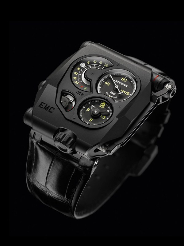 URWERK EMC BLACK 型號:EMC BLACK 機芯 UR-EMC手動上鍊機芯動力儲存80小時 功能 時,分,秒;精度差,動力儲備,配備電子光學傳感器,部份Super-LumiNova®夜光處理防水30米 錶殼、錶盤和指針 43 x 51mm黑色DLC處理鈦鋼錶殼 錶帶和錶扣 皮革錶帶 分享到: