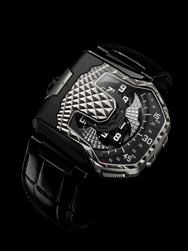 URWERK UR-T8 型號:UR-T8 BICOLOR 機芯 UR-8.01自動上鍊機芯,雙渦輪葉調節動力儲能存39小時 功能 衛星小時、數字分鐘,翻轉錶盤,部份Super-LumiNova®夜光處理防水30米,限量30只 錶殼、錶盤和指針 60.2 x 48.3 mm鈦金屬錶殼 錶帶和錶扣 皮革錶帶 分享到: